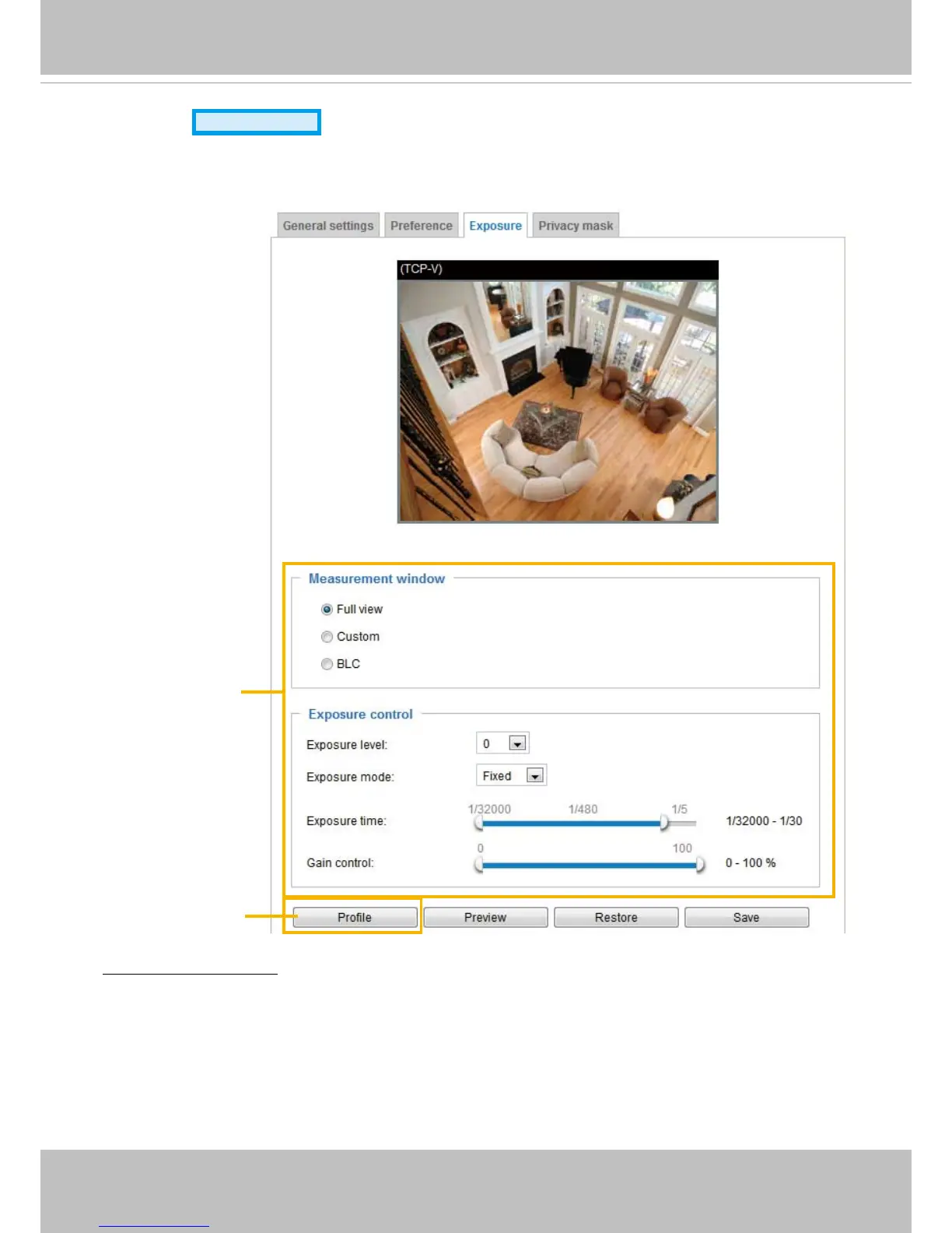 On this page, you can set the Exposure measurement window, Exposure level, Exposure mode,