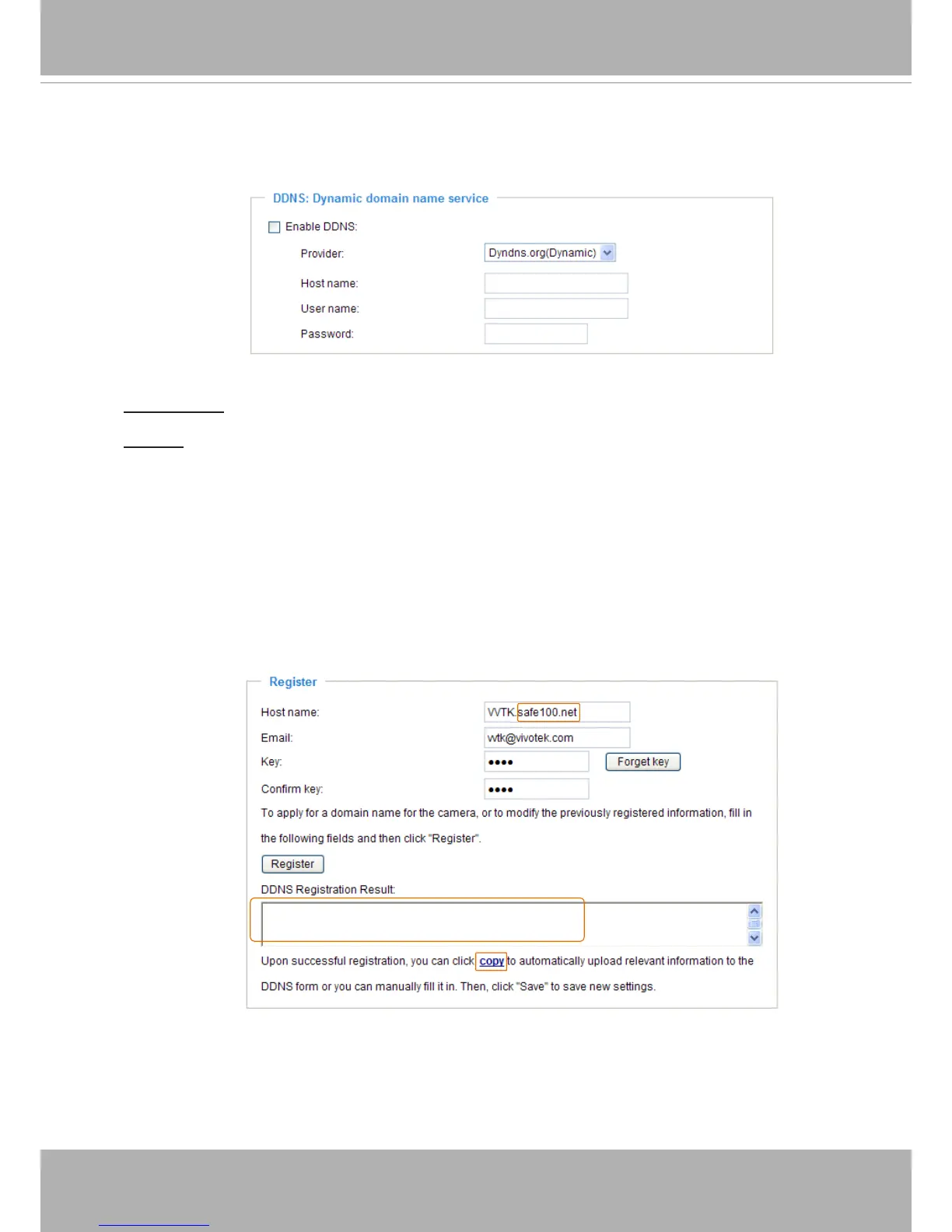 2. In the Register column, ll in the Host name (xxxx.safe100.net), Email, Key, and Conrm Key,