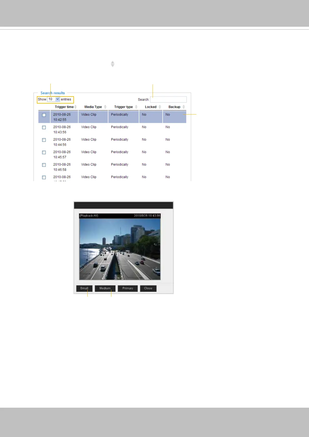The following is an example of search results. There are four columns: Trigger time, Media type,