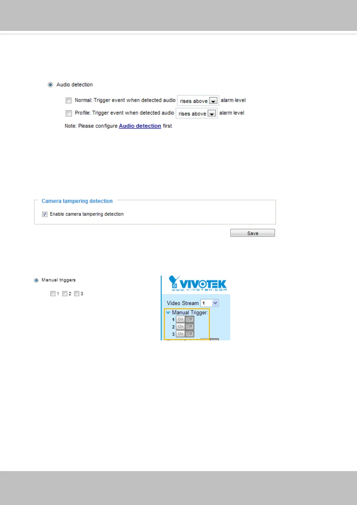 This option allows the Network Camera to trigger when the camera detects that is is being tampered