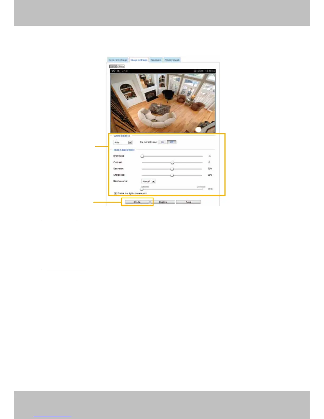 On this page, you can tune the White balance, Image adjustment, and low light compensation.