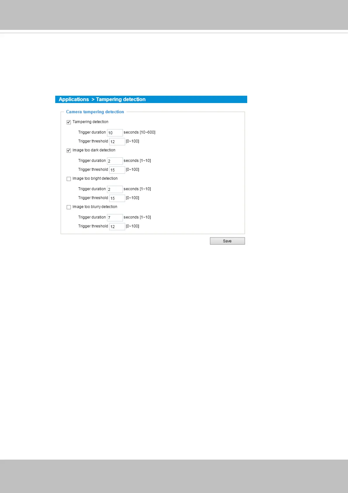 1. Click to select the checkbox before tampering conditions: Tampering detection, Image too