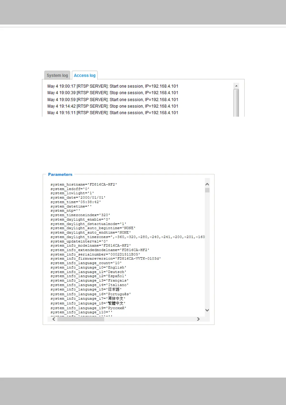 administrators) in a chronological order. The access log is stored in the Network Camera’s buffer and