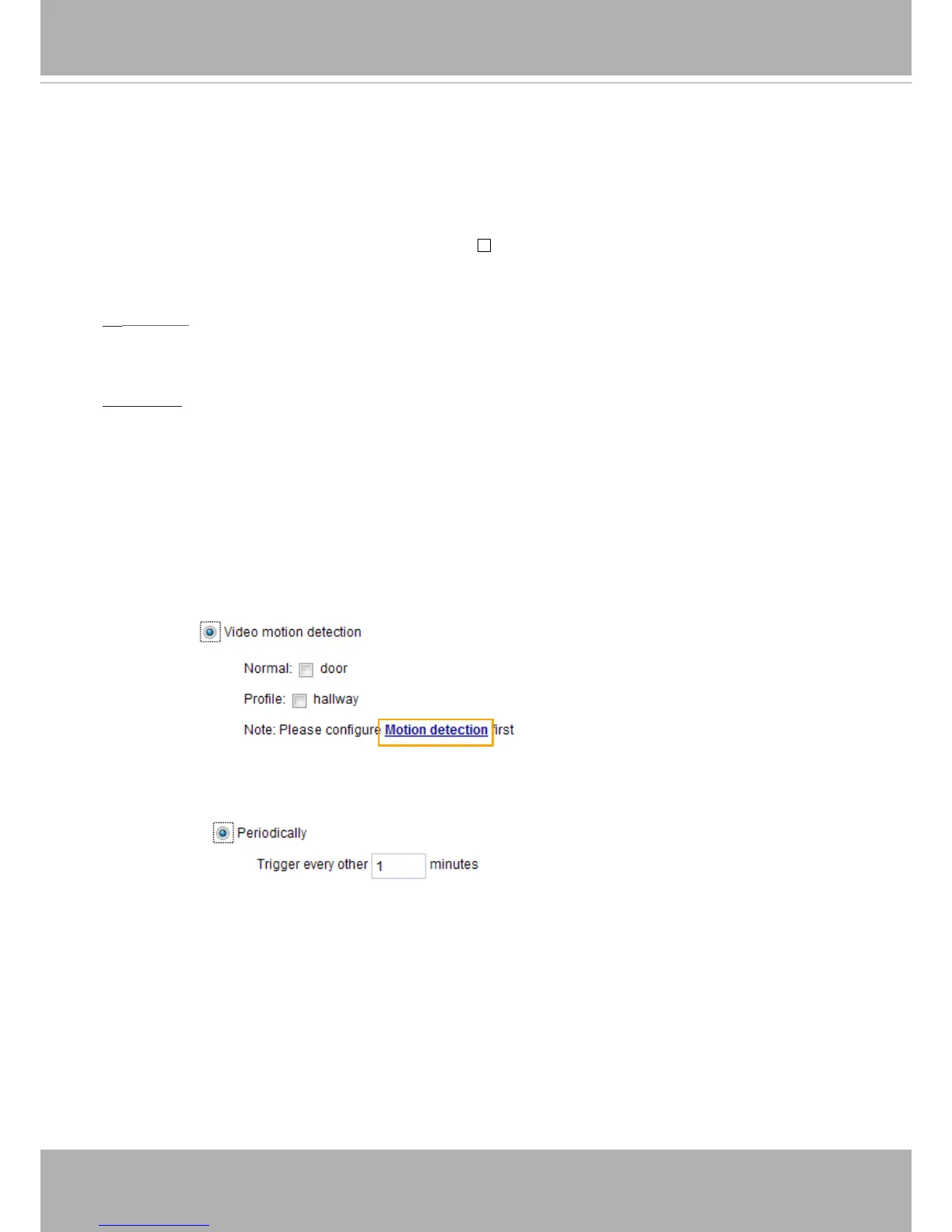 This option allows the Network Camera to trigger periodically for every other dened minute. Up to 999