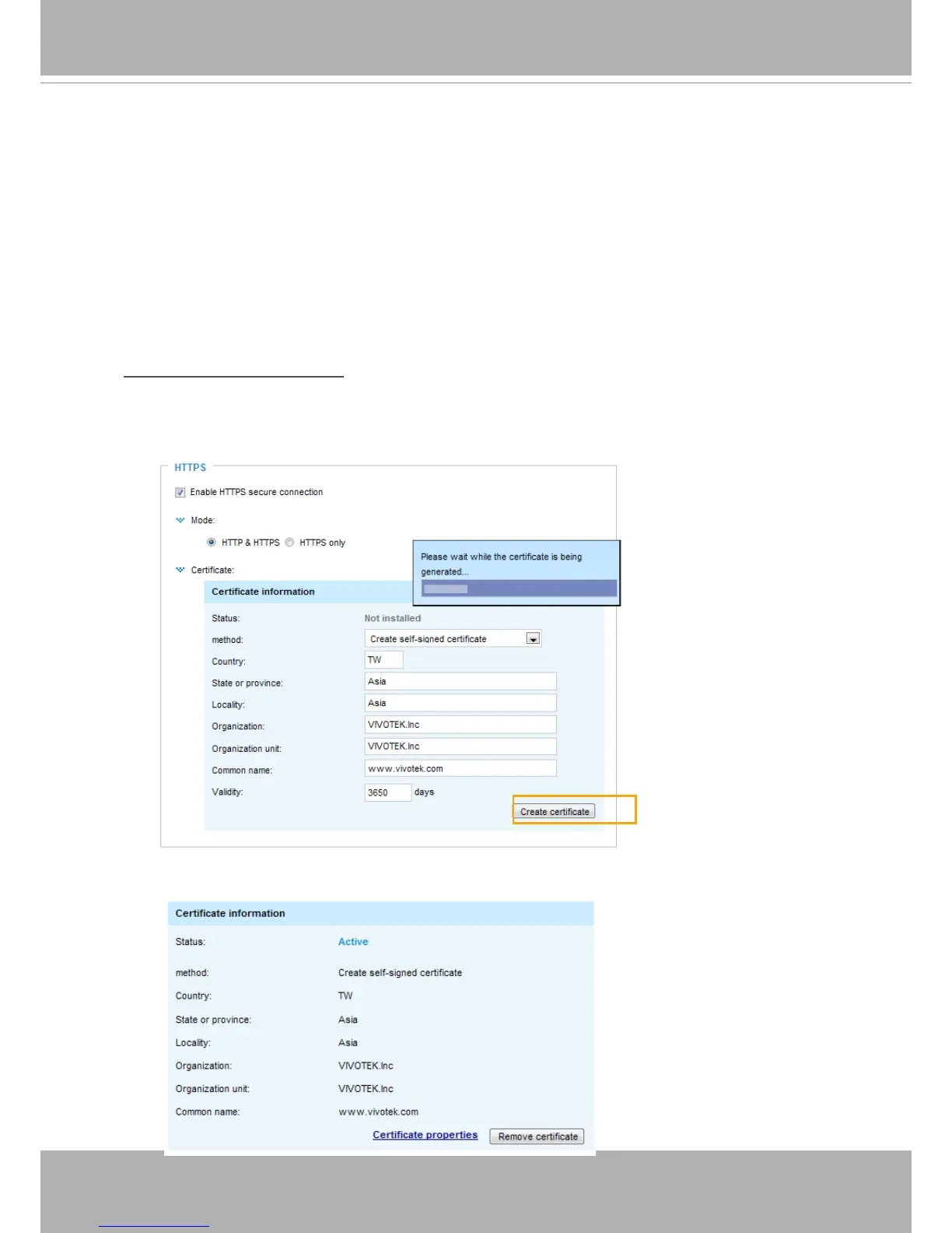 Before using HTTPS for communication with the Network Camera, a Certicate must be created