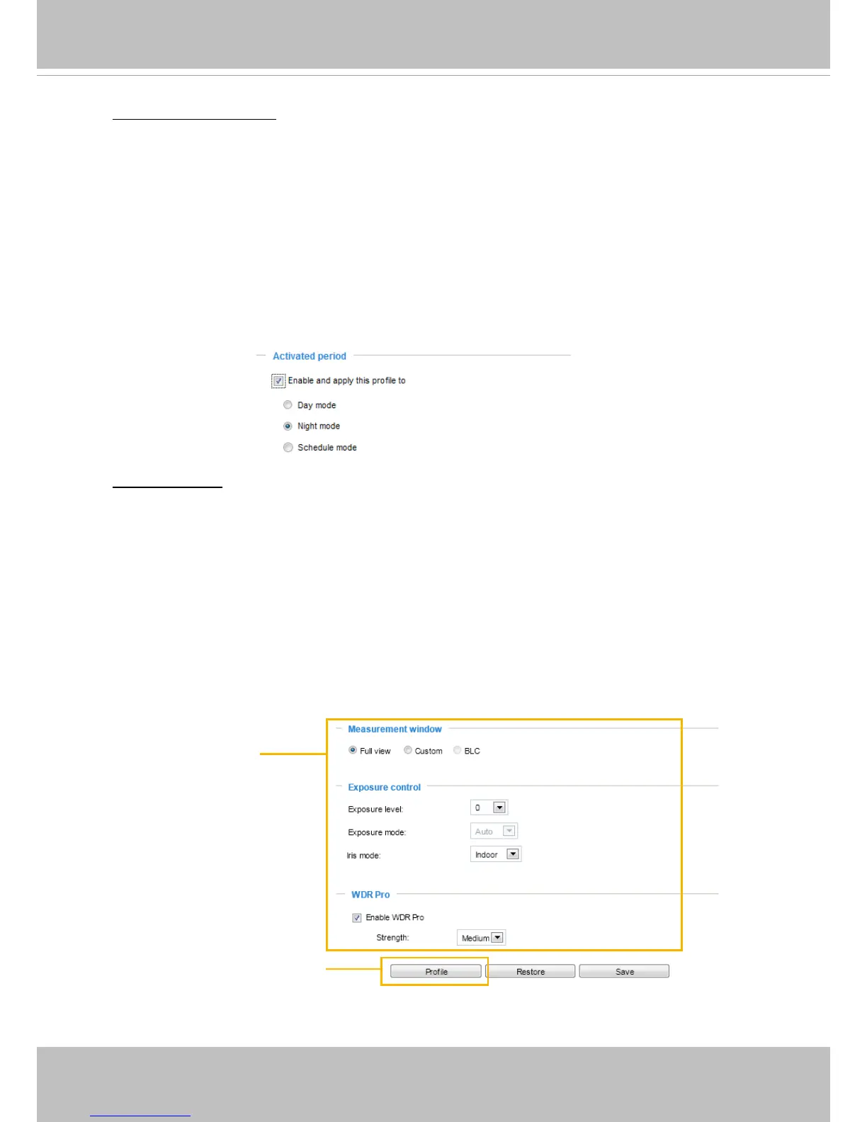 On this page, you can set the Measurement window, Exposure level, Exposure mode, and
