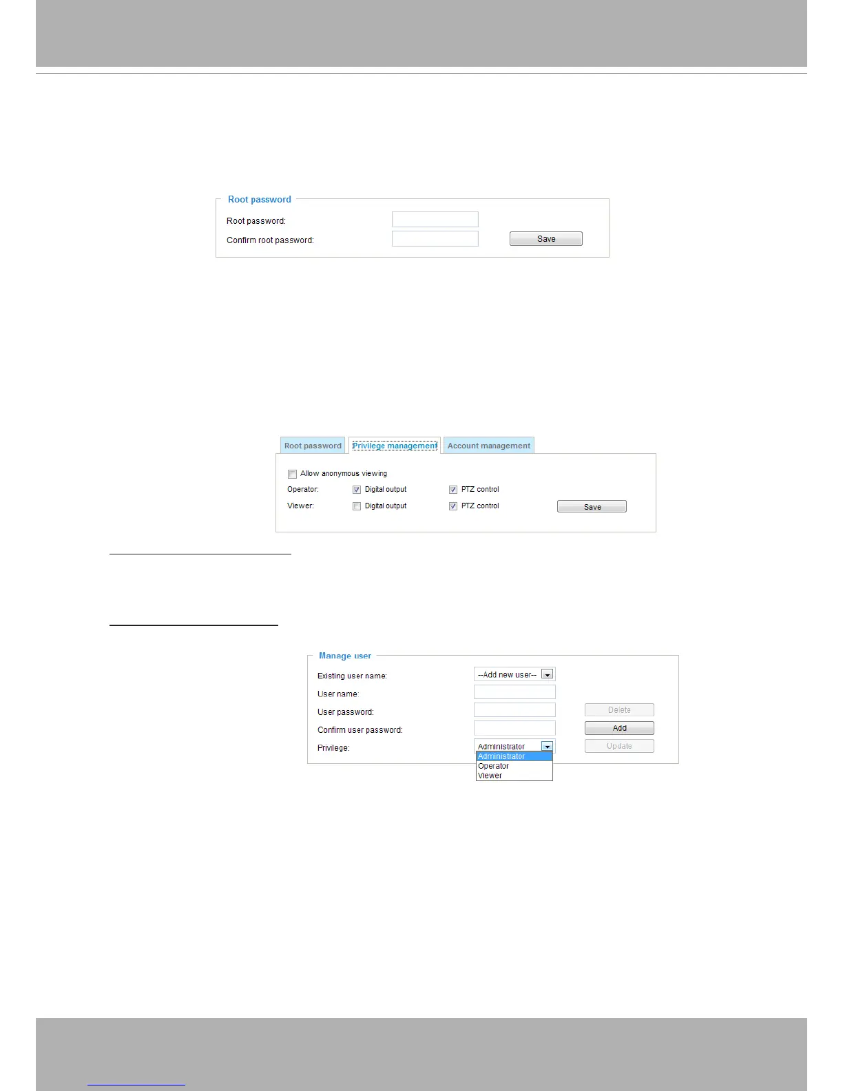 Digital Output & PTZ control: You can modify the management privilege for operators or viewers.