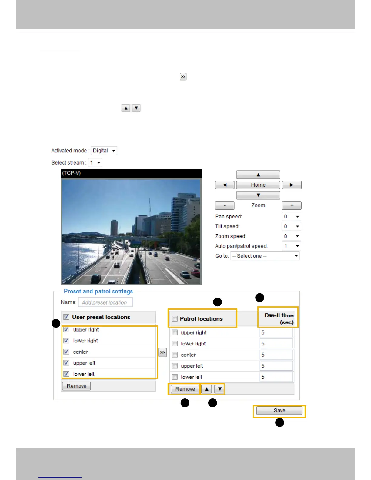 4� If you want to delete a preset location from the Patrol locations list, select it and click Remove�