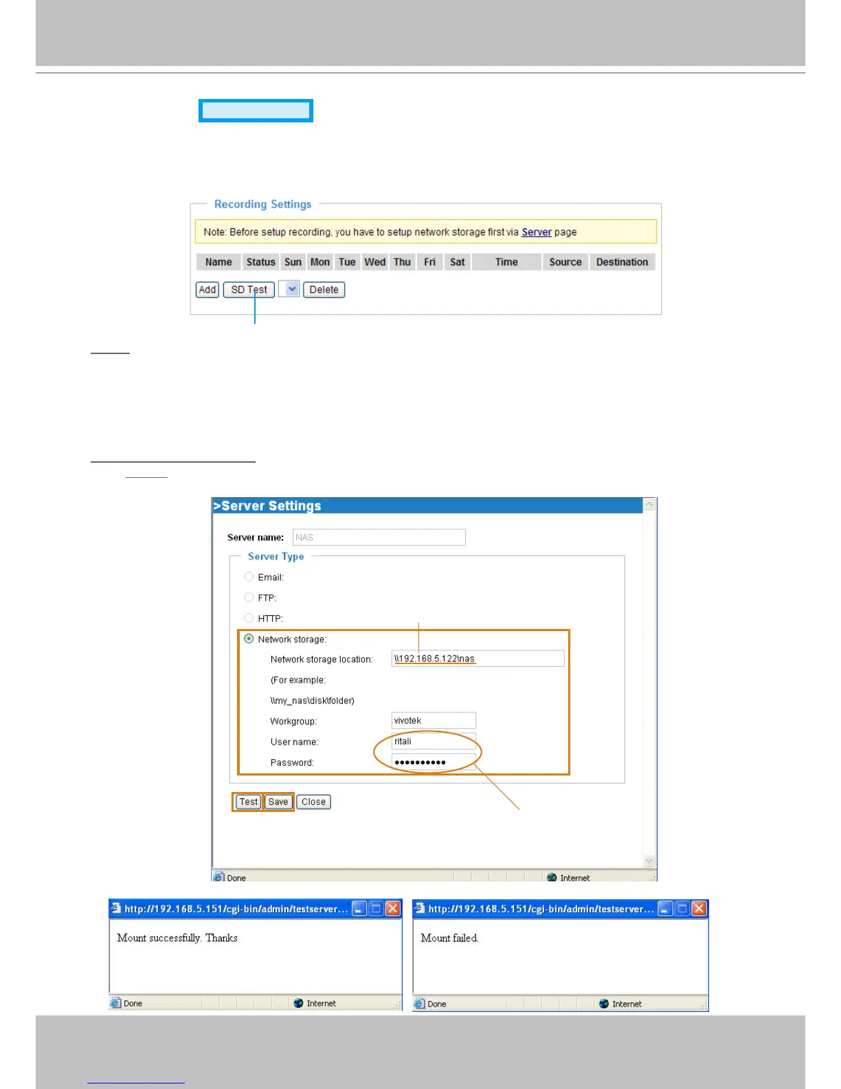 ► Before setting up this page, please set up the Network Storage on the Server Settings page rst.