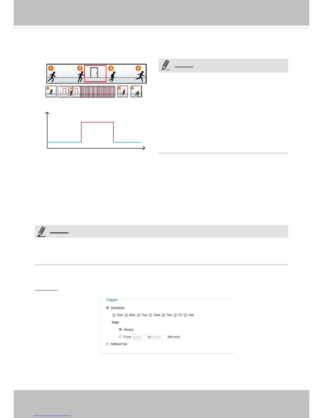 The alarm trigger includes: motion detection and DI detection. Please refer to Event Settings on page 99.