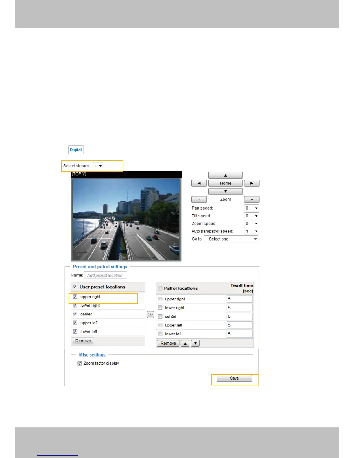 Select Stream: Select stream #1 to set up the e-PTZ control. Please note that each stream can possess