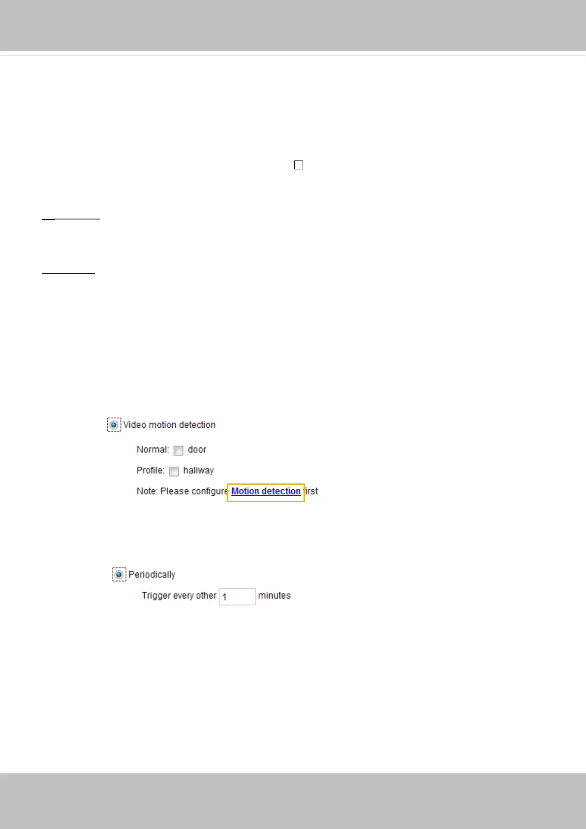 This option allows the Network Camera to trigger periodically for every other dened minute. Up to 999