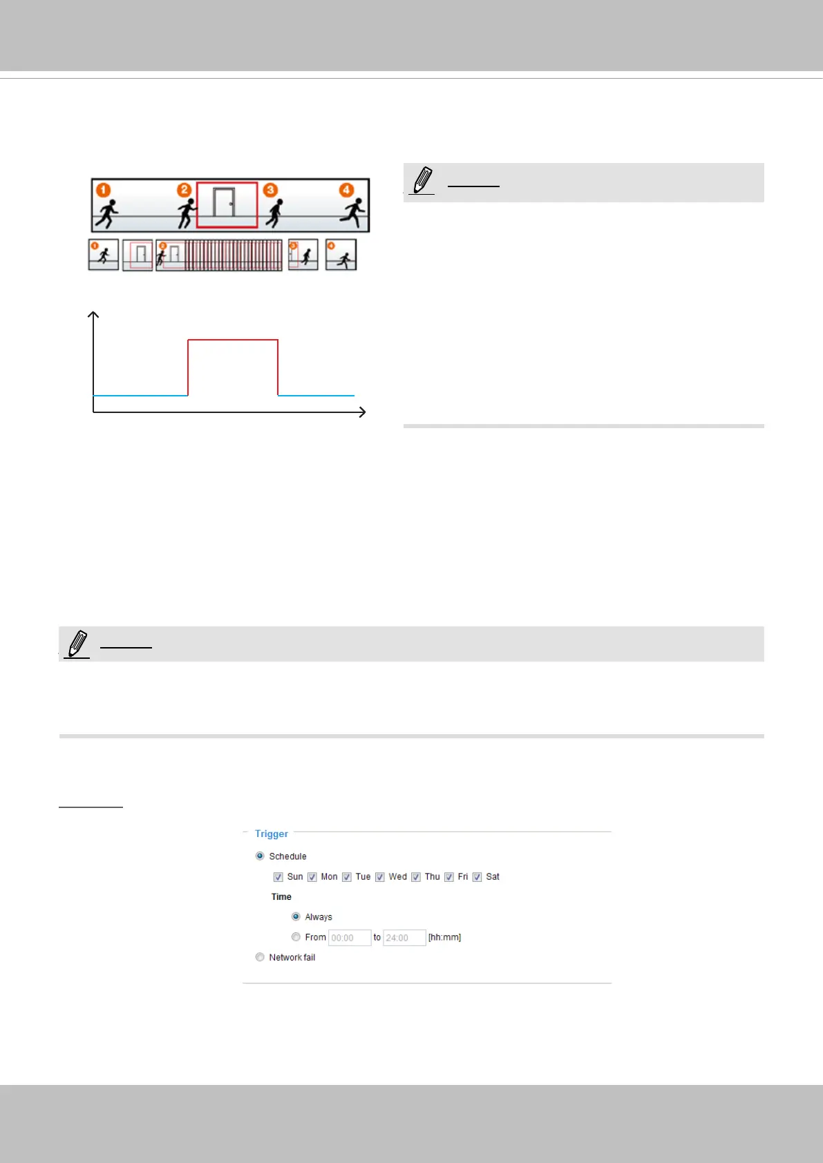 The alarm trigger includes: motion detection and DI detection. Please refer to Event Settings on page 99.