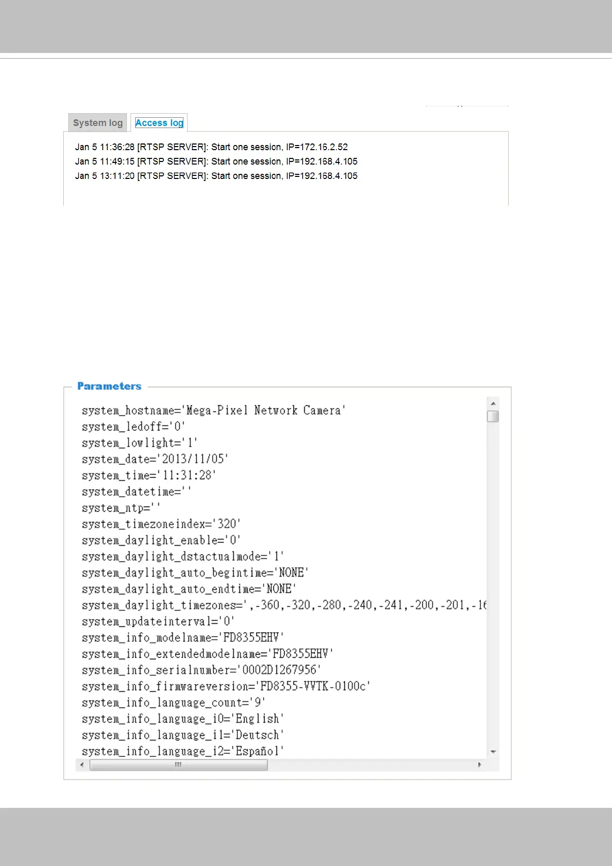 administrators) in a chronological order. The access log is stored in the Network Camera’s buffer
