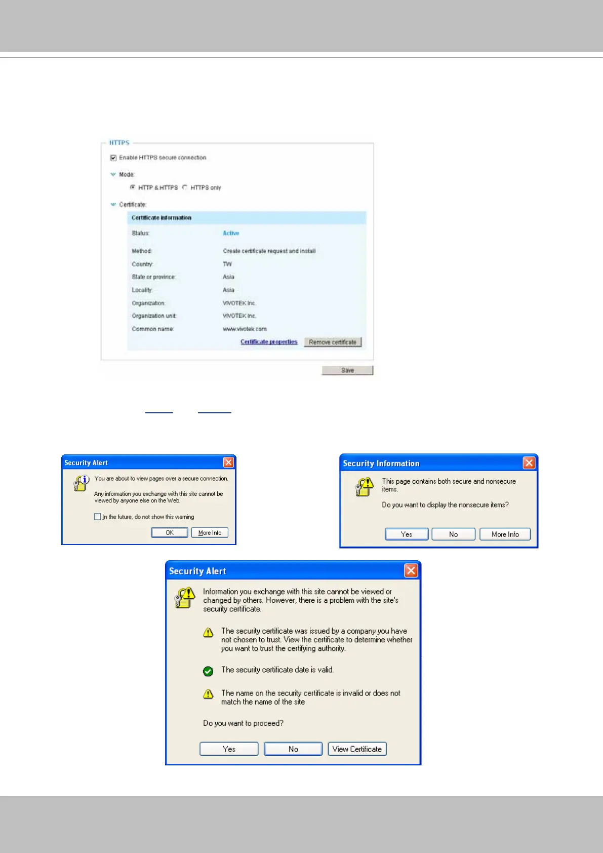 Security Alert dialogs will pop up. Click OK or Yes to enable HTTPS.