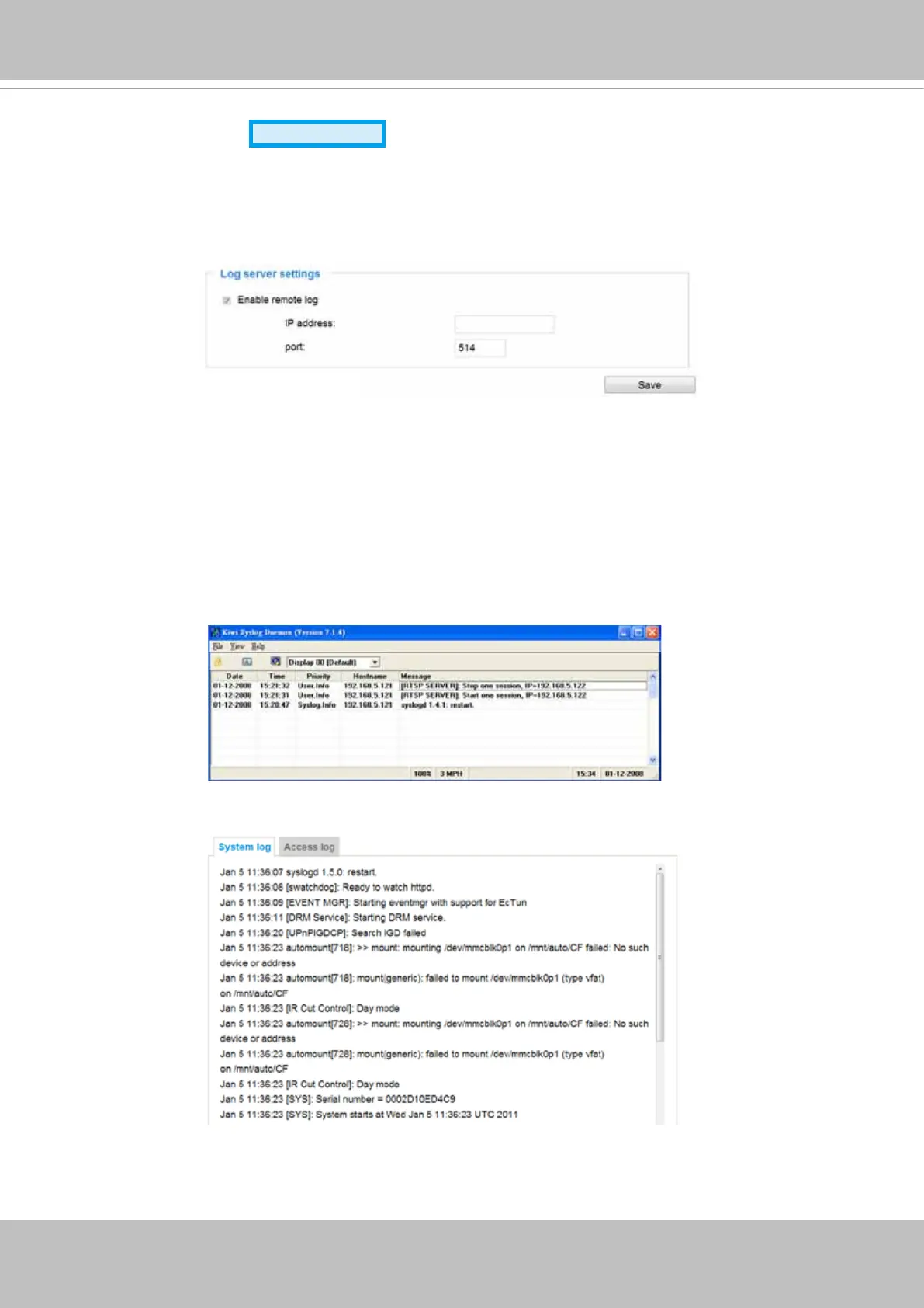 This section explains how to congure the Network Camera to send the system log to a remote