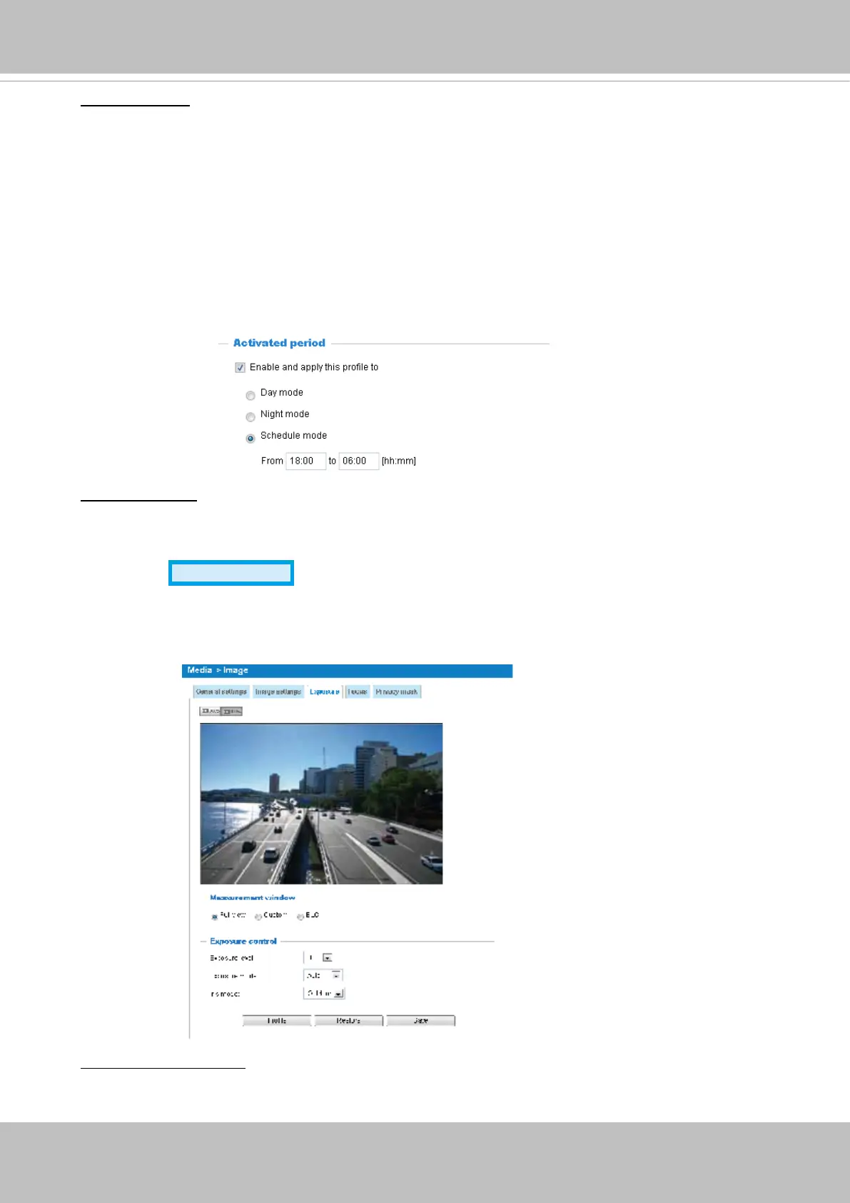 On this page, you can set the Measurement window, Exposure level, and Exposure mode. Detailed