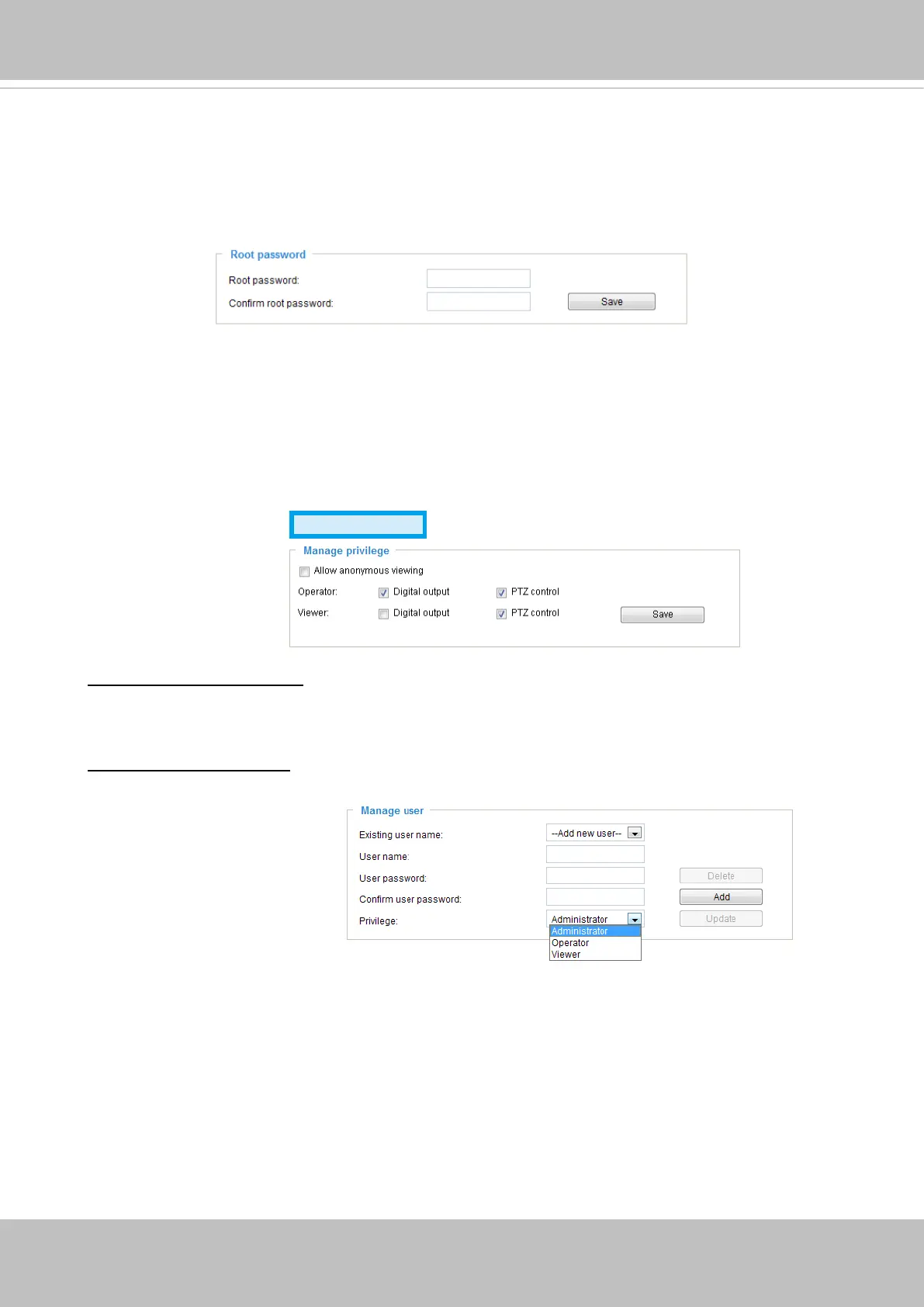 Digital Output & PTZ control: You can modify the manage privilege of operators or viewers. Check
