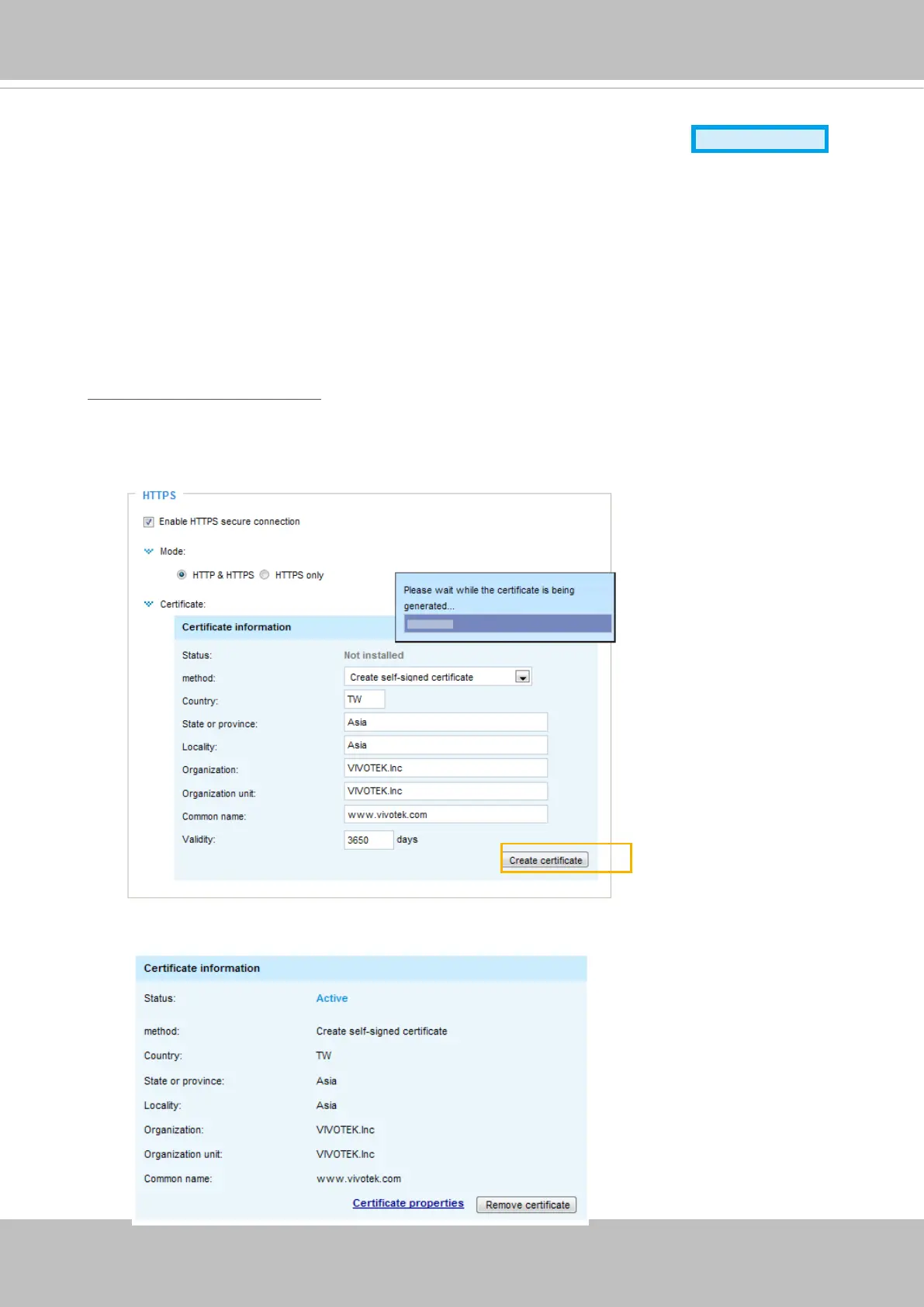 Before using HTTPS for communication with the Network Camera, a Certicate must be created