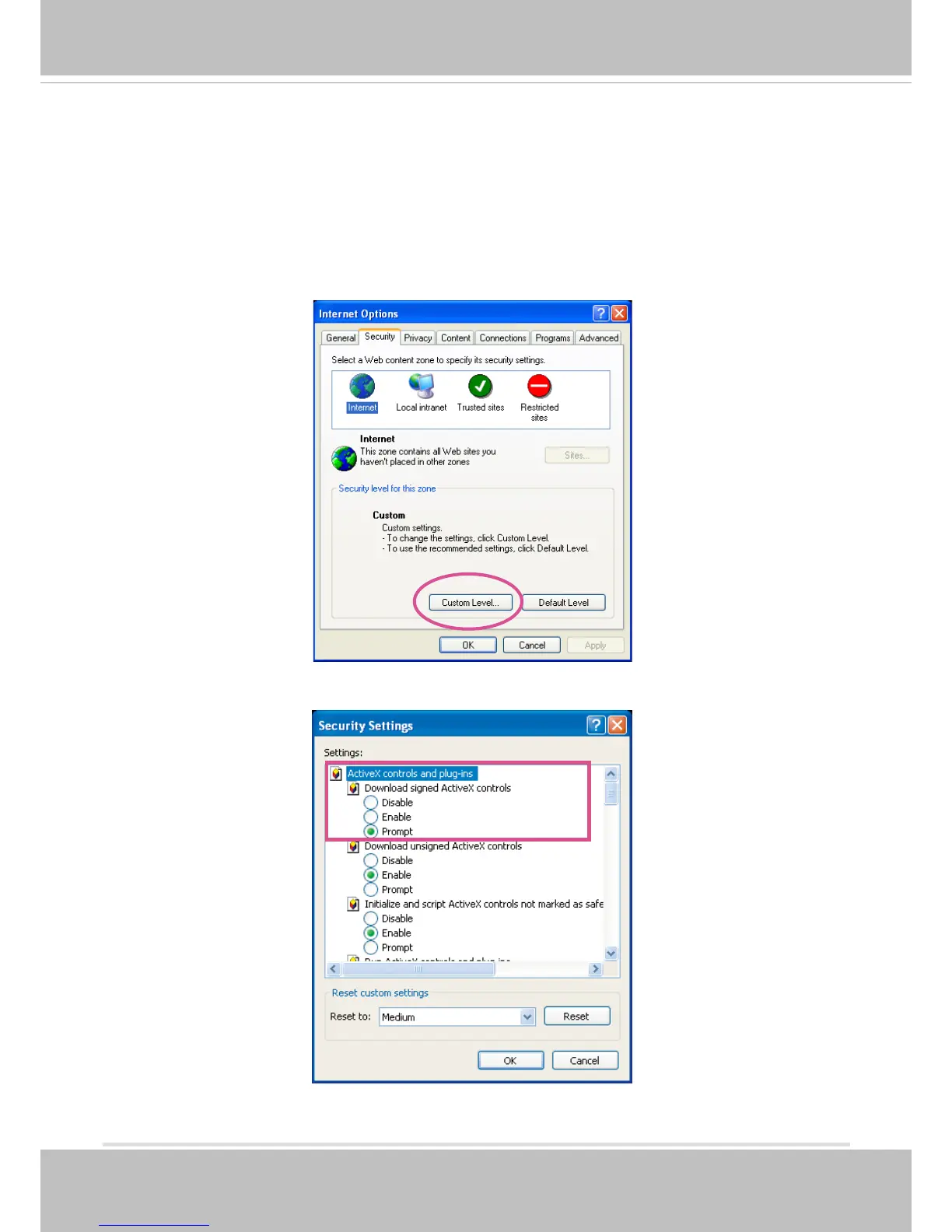 ► If you see a dialog box indicating that your security settings prohibit running ActiveX