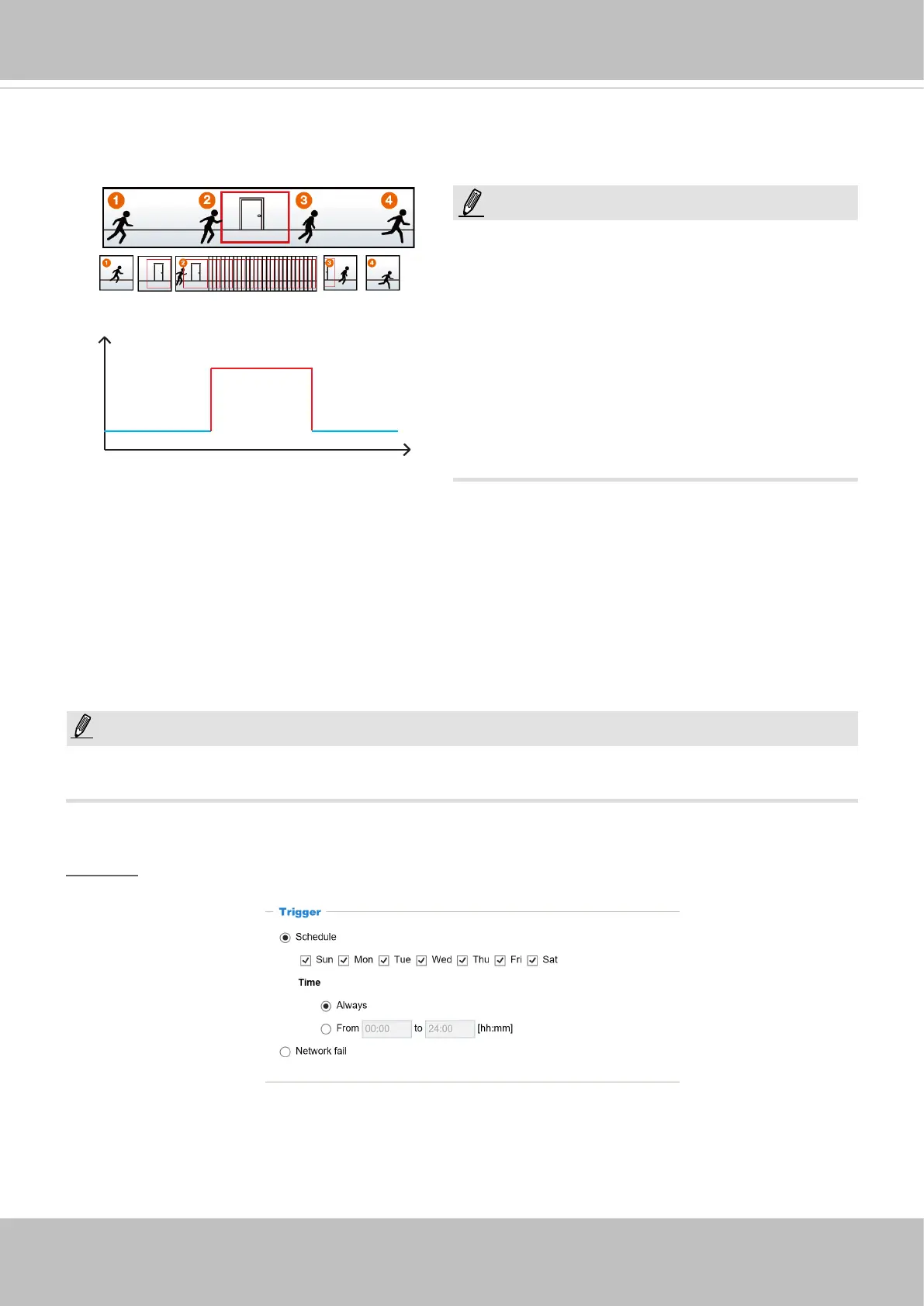 The alarm trigger includes: motion detection and DI detection. Please refer to Event Settings on page 117.
