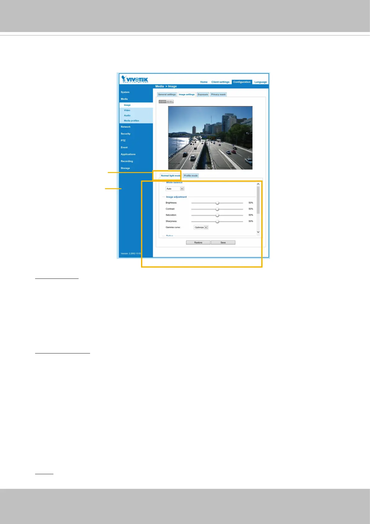 On this page, you can tune the White balance and Image adjustment.