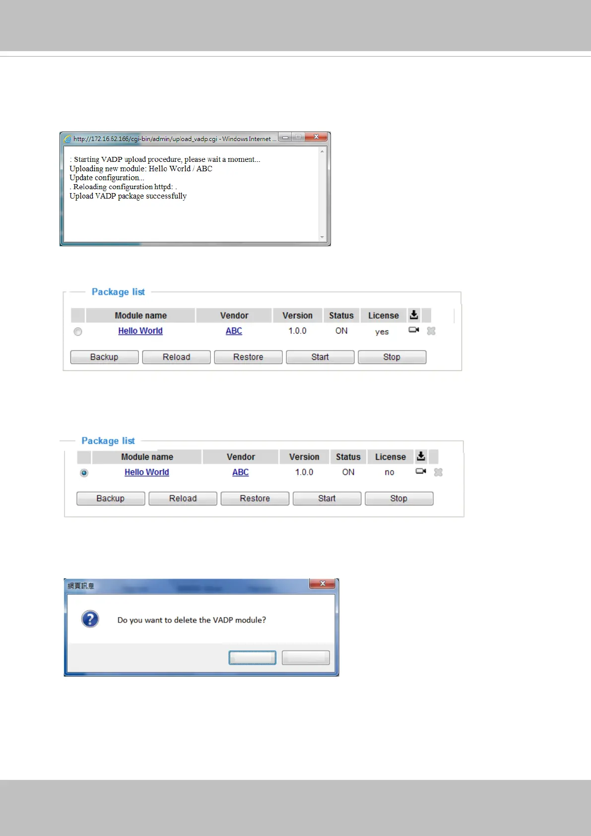 Stop button. By then the module status will become OFF, and the X button will appear at