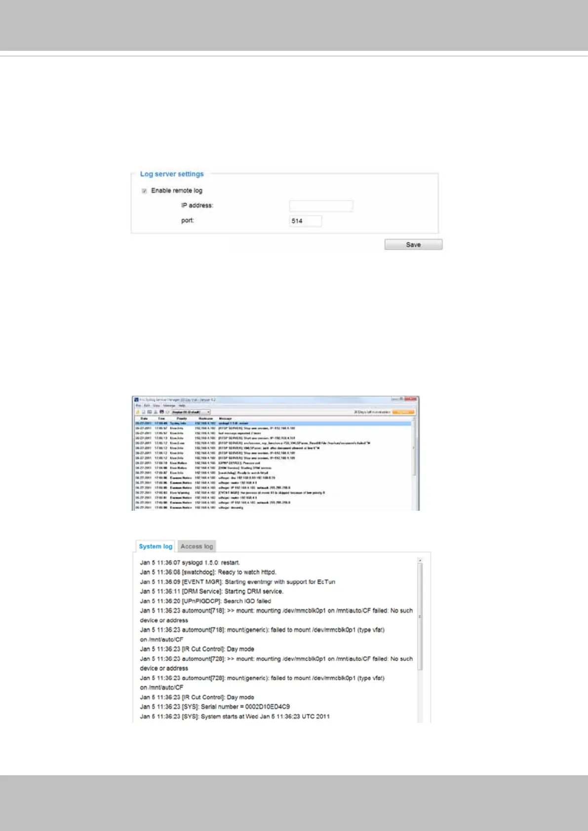 messages from the Network Camera. An example is Kiwi Syslog Daemon. Visit http://www.kiwisyslog.
