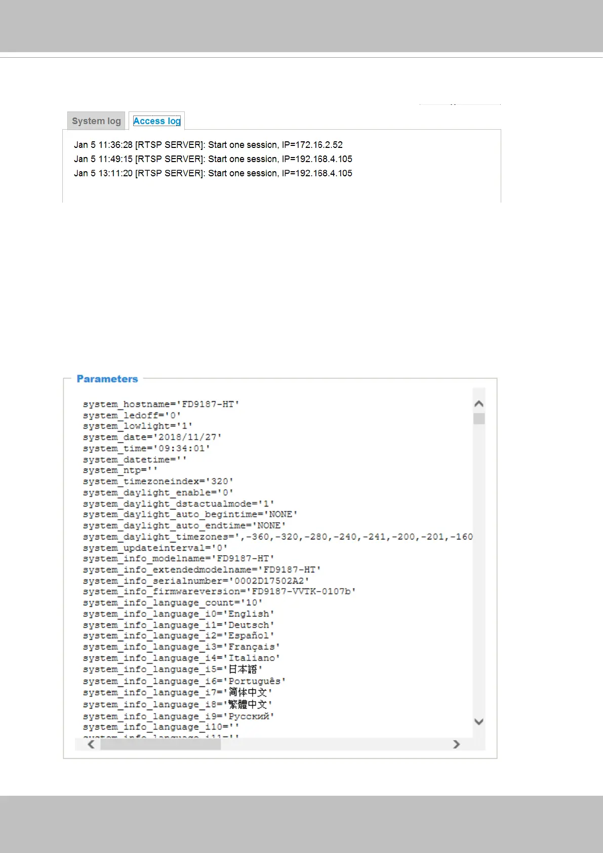 administrators) in a chronological order. The access log is stored in the Network Camera’s buffer