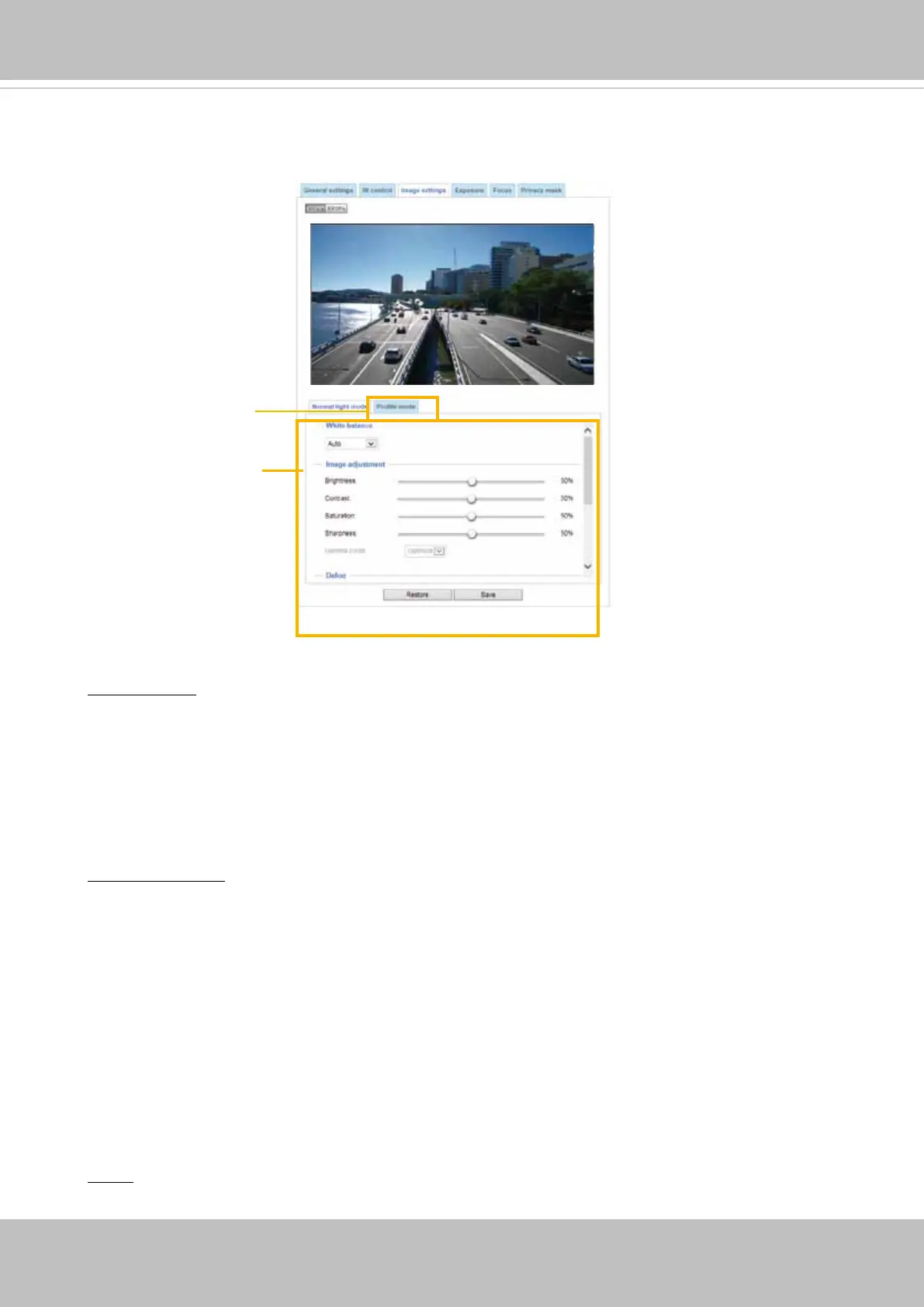 On this page, you can tune the White balance and Image adjustment.