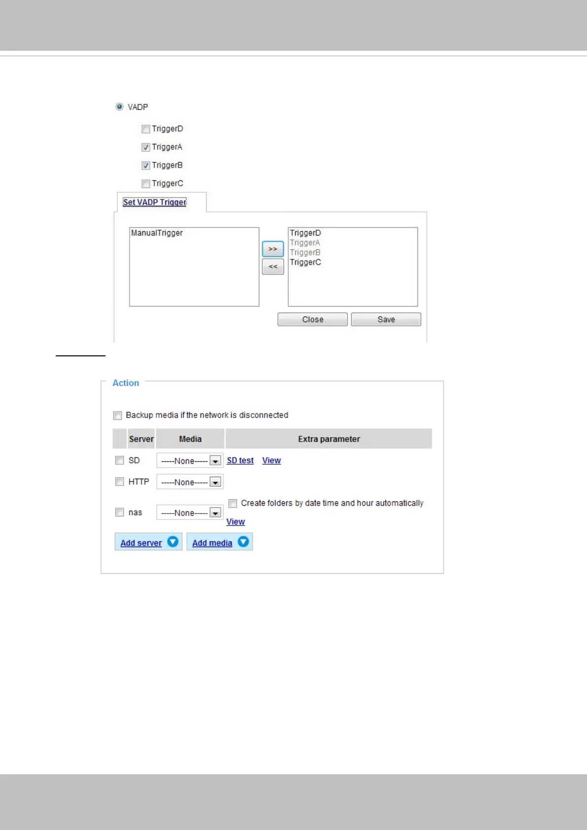 Dene the actions to be performed by the Network Camera when a trigger is activated.