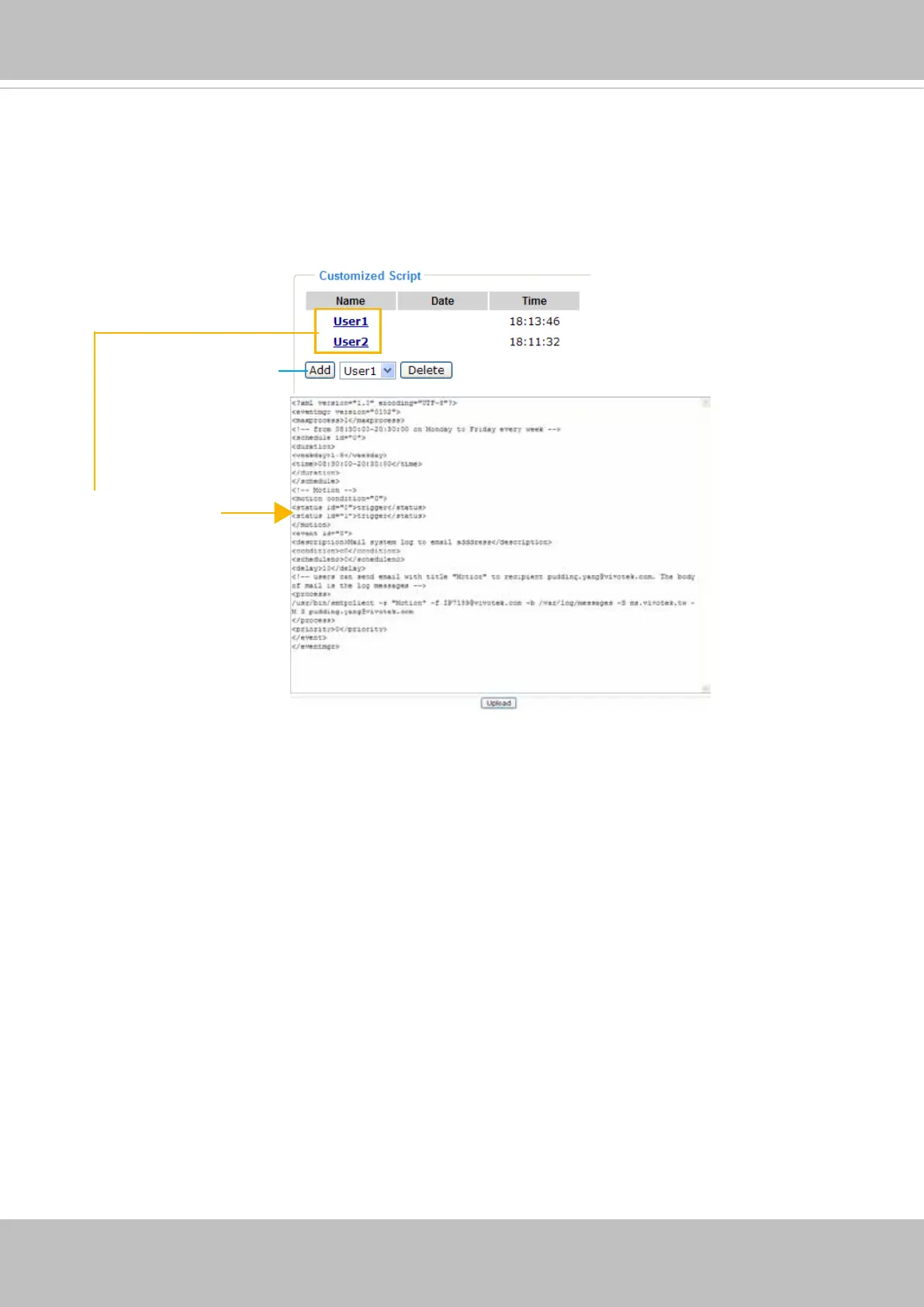 This function allows you to upload a sample script (.xml le) to the camera, which will save your time on