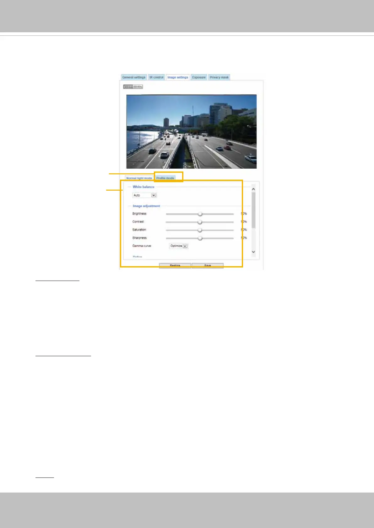 On this page, you can tune the White balance and Image adjustment.