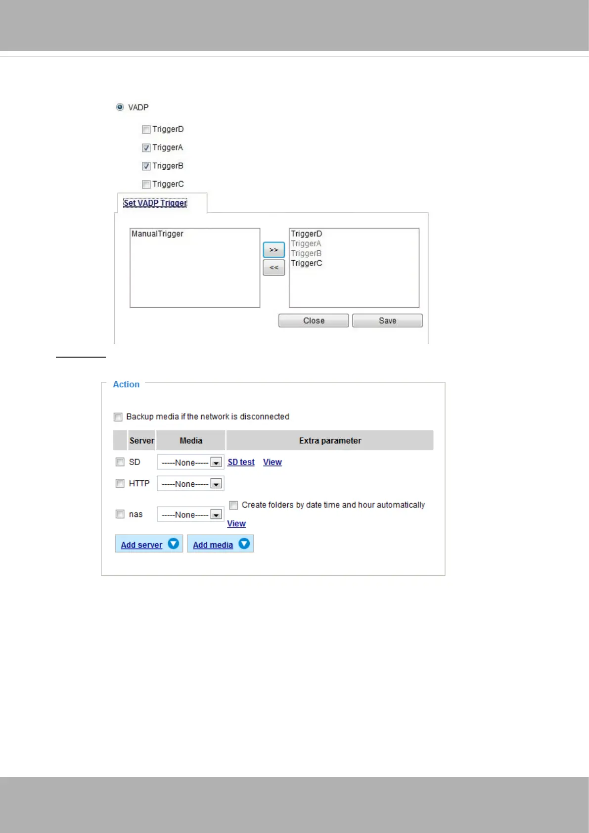 Dene the actions to be performed by the Network Camera when a trigger is activated.