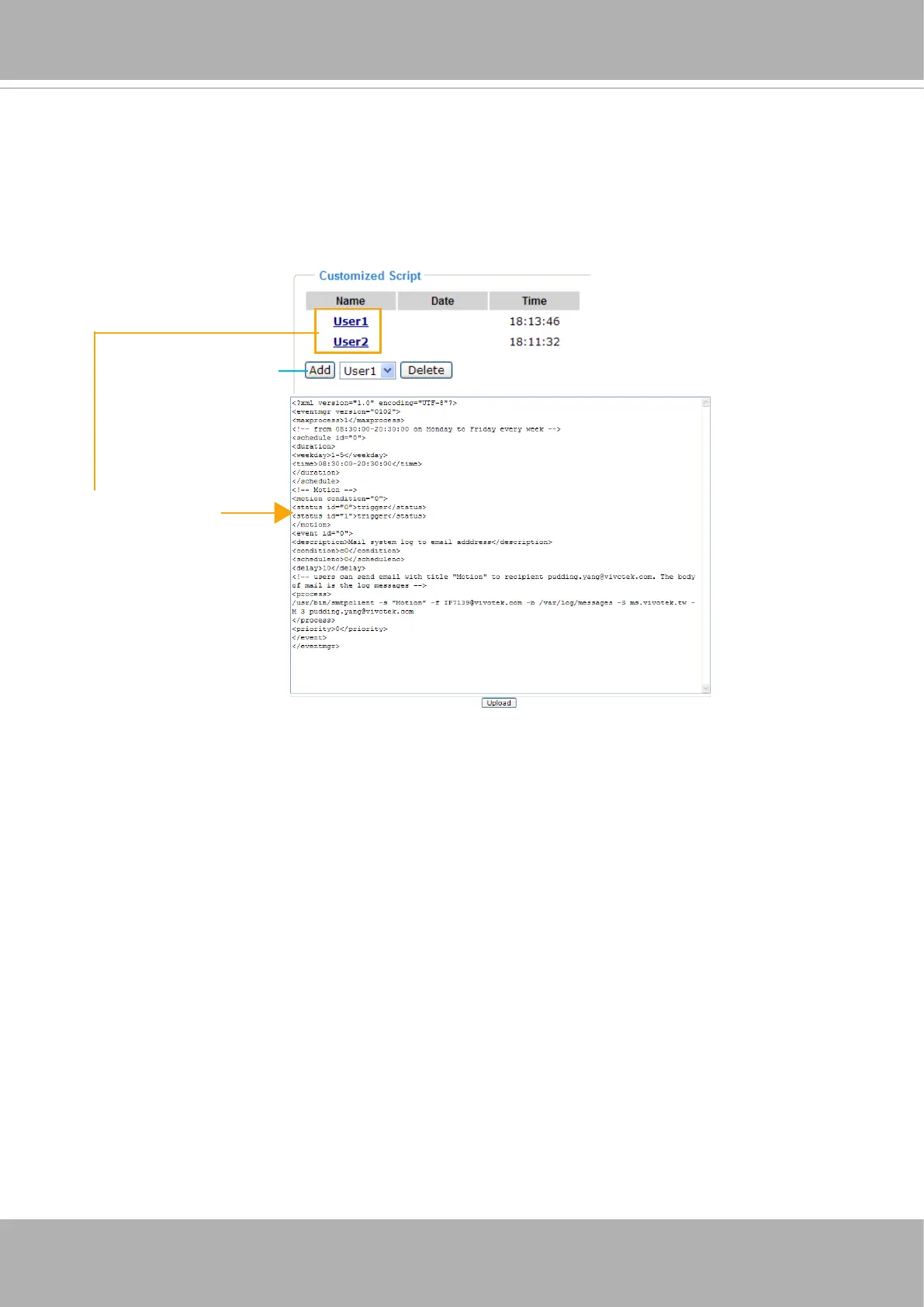 This function allows you to upload a sample script (.xml le) to the camera, which will save your time on