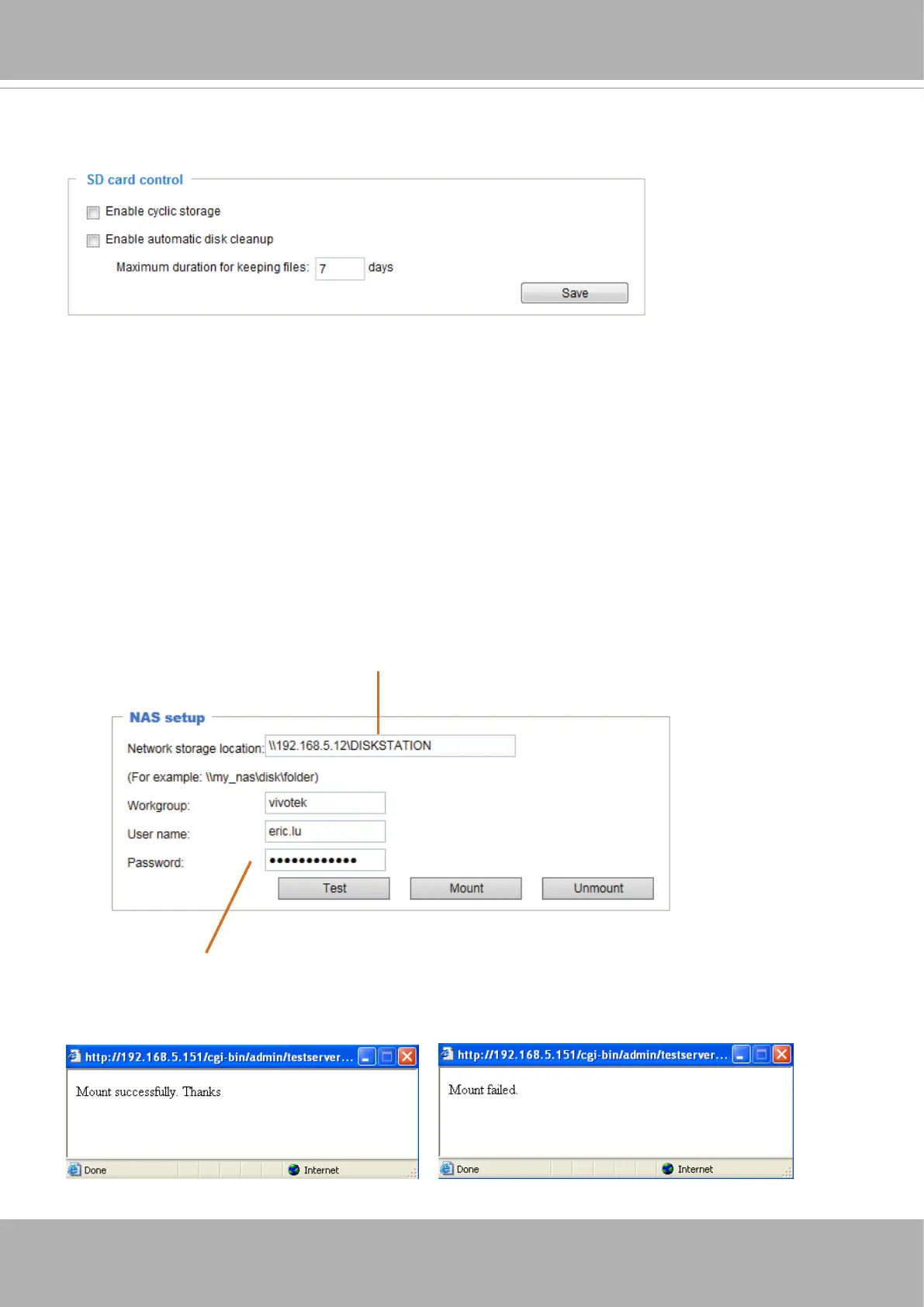On the NAS setup page you can congure your NAS (Networked Storage) conguration, test, mount, or