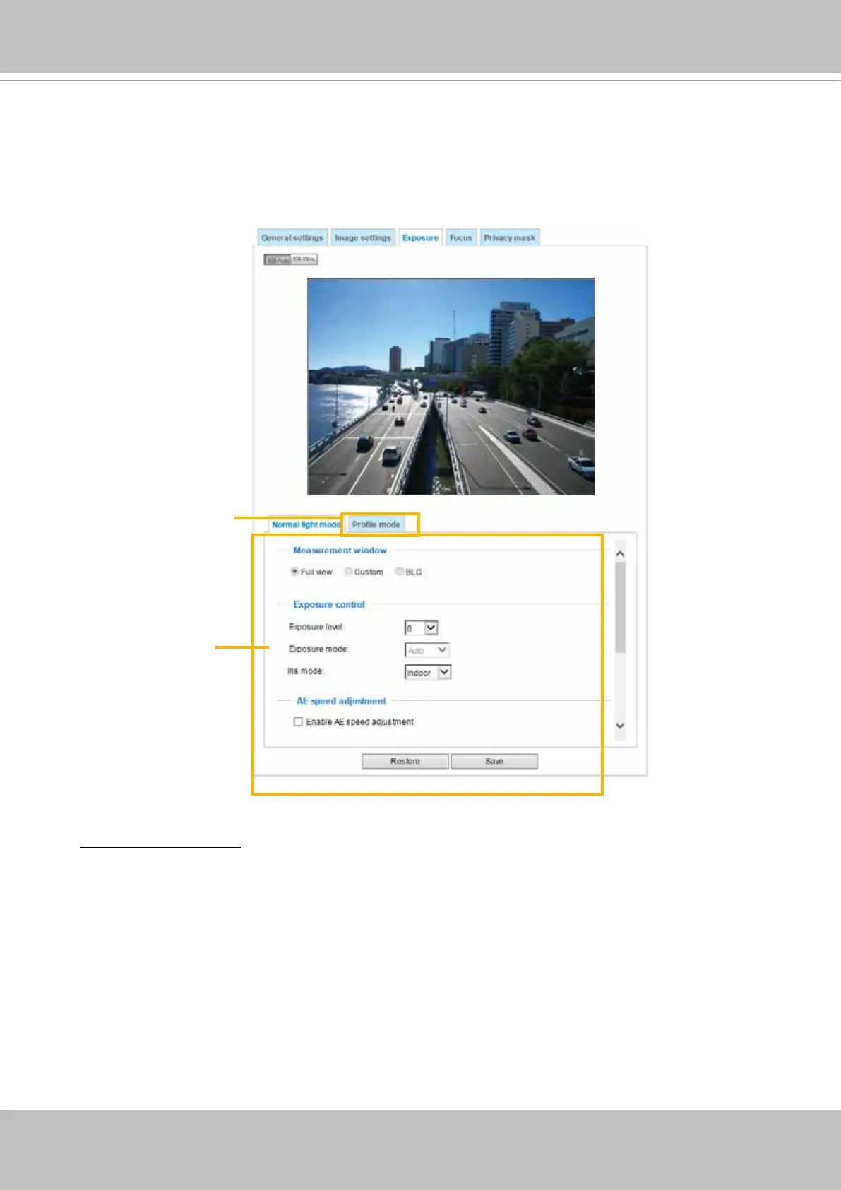 On this page, you can set the Exposure measurement window, Exposure level, Exposure mode,