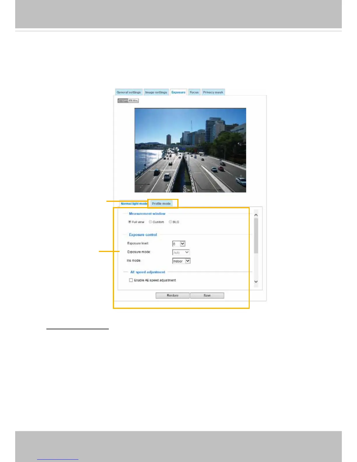 On this page, you can set the Exposure measurement window, Exposure level, Exposure mode,