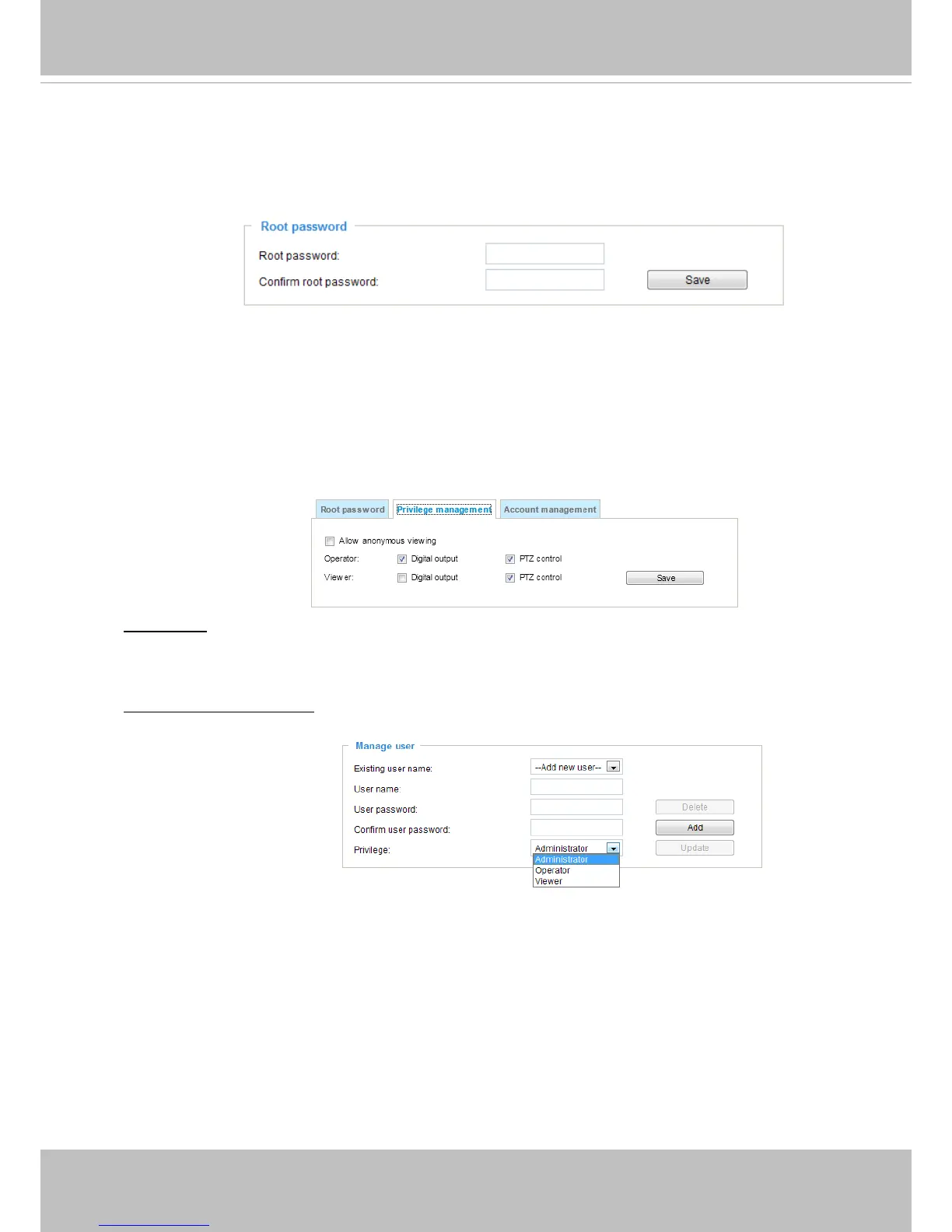 PTZ control: You can modify the management privilege for operators or viewers. Select or deselect