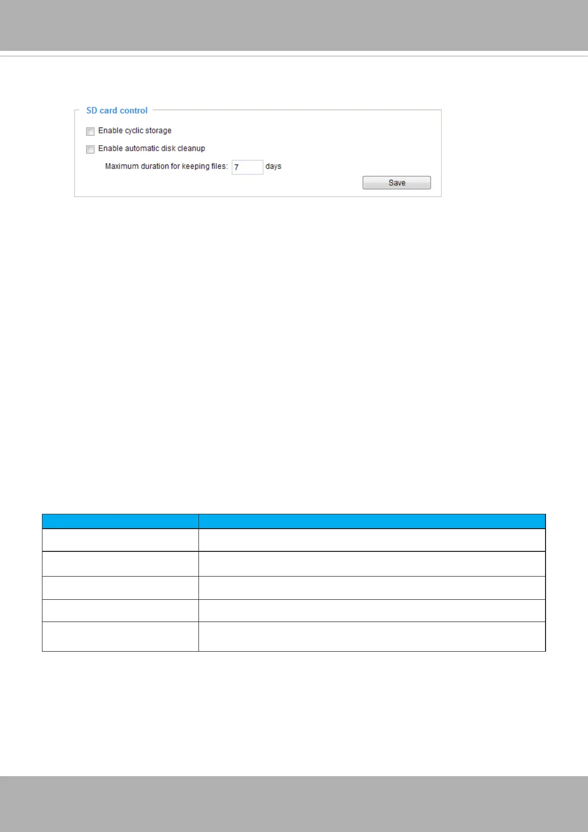 For example, if you enter “7 days”, the recorded les will be stored on the SD card for 7 days.