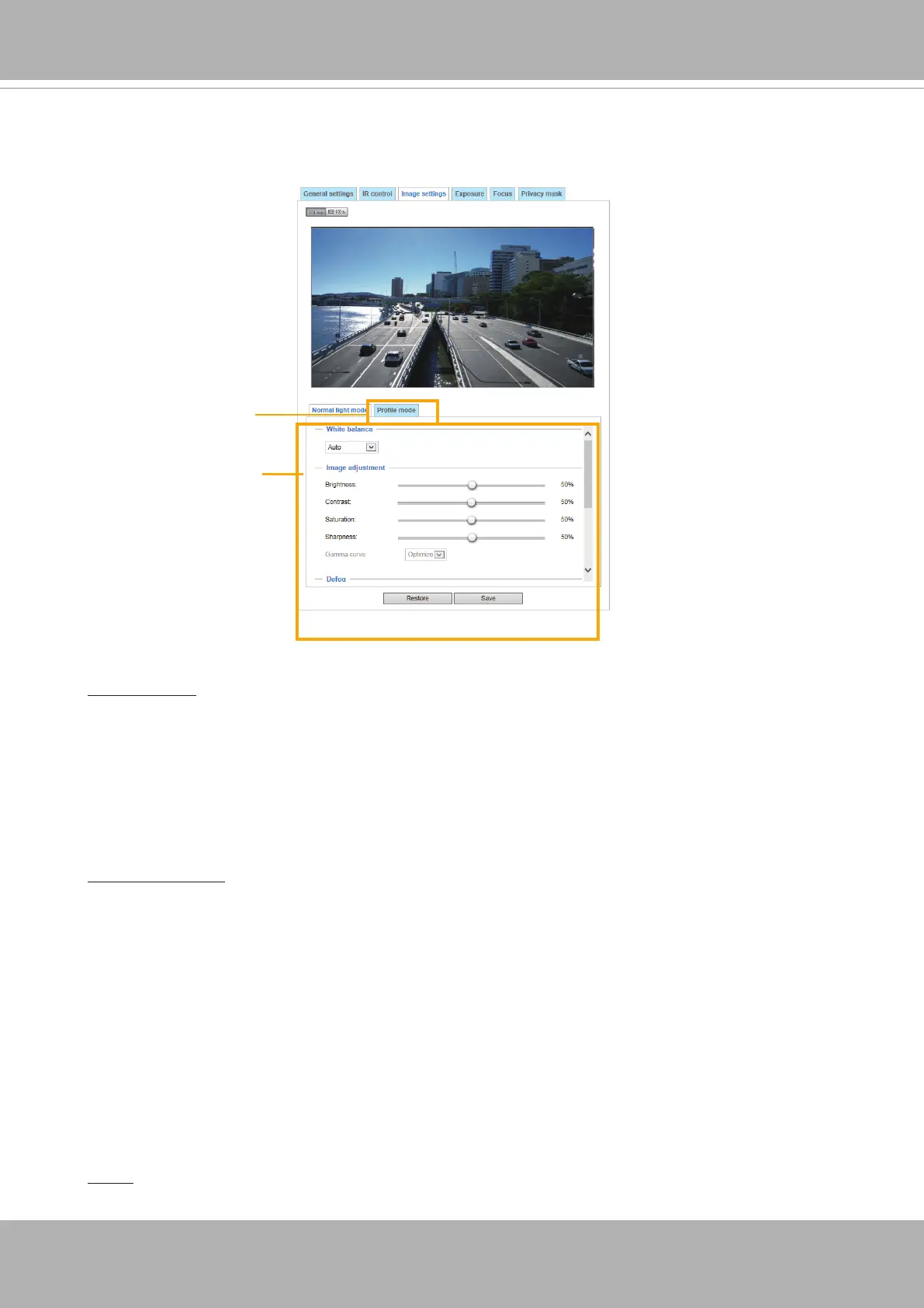 On this page, you can tune the White balance and Image adjustment.