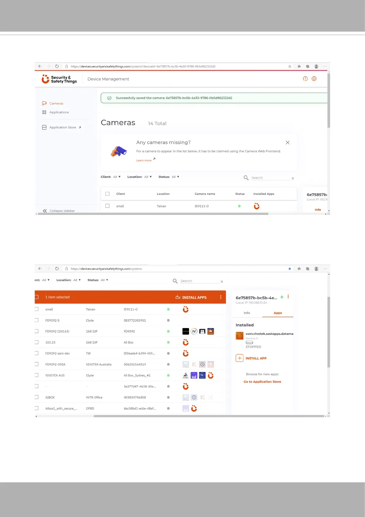 On the Device Management Portal page, you can see all connected devices/cameras.