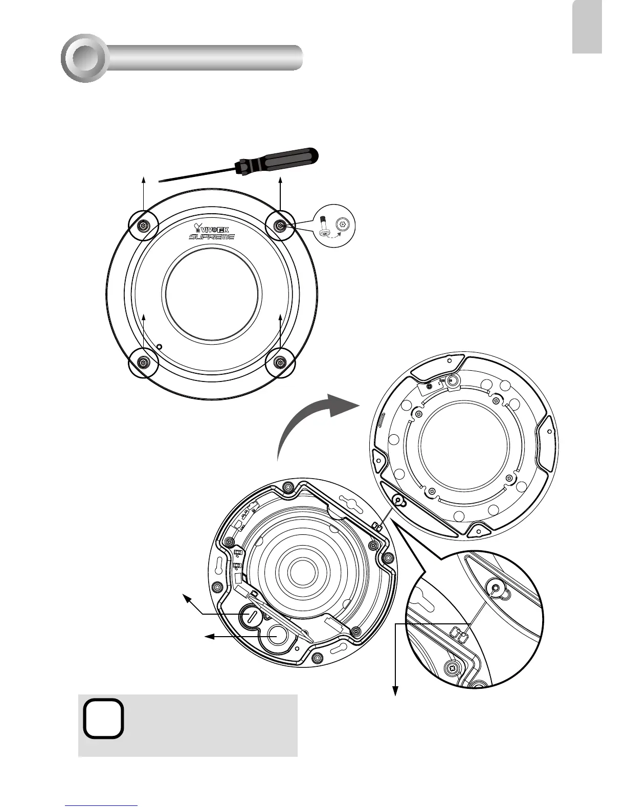 First, use the supplied screwdriver to loose the four screws and detach the dome cover from the