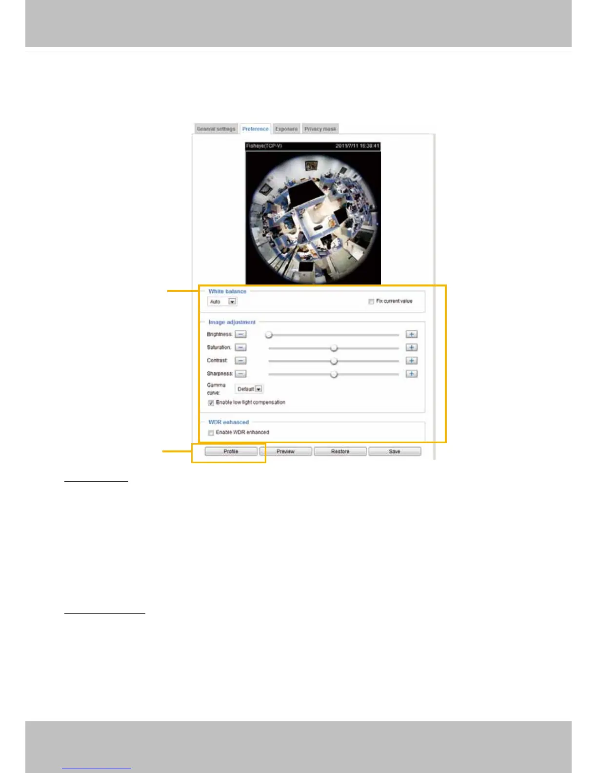 On this page, you can tune the White balance, Image adjustment and WDR enhanced parameters. You