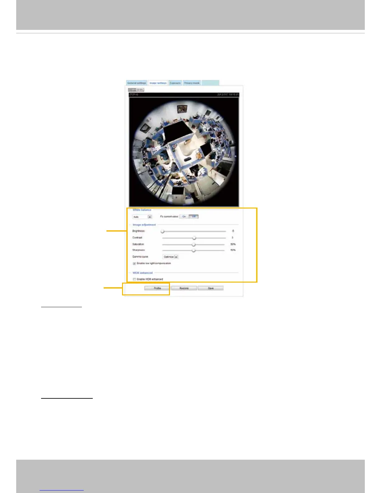 On this page, you can tune the White balance, Image adjustment and WDR enhanced parameters. You