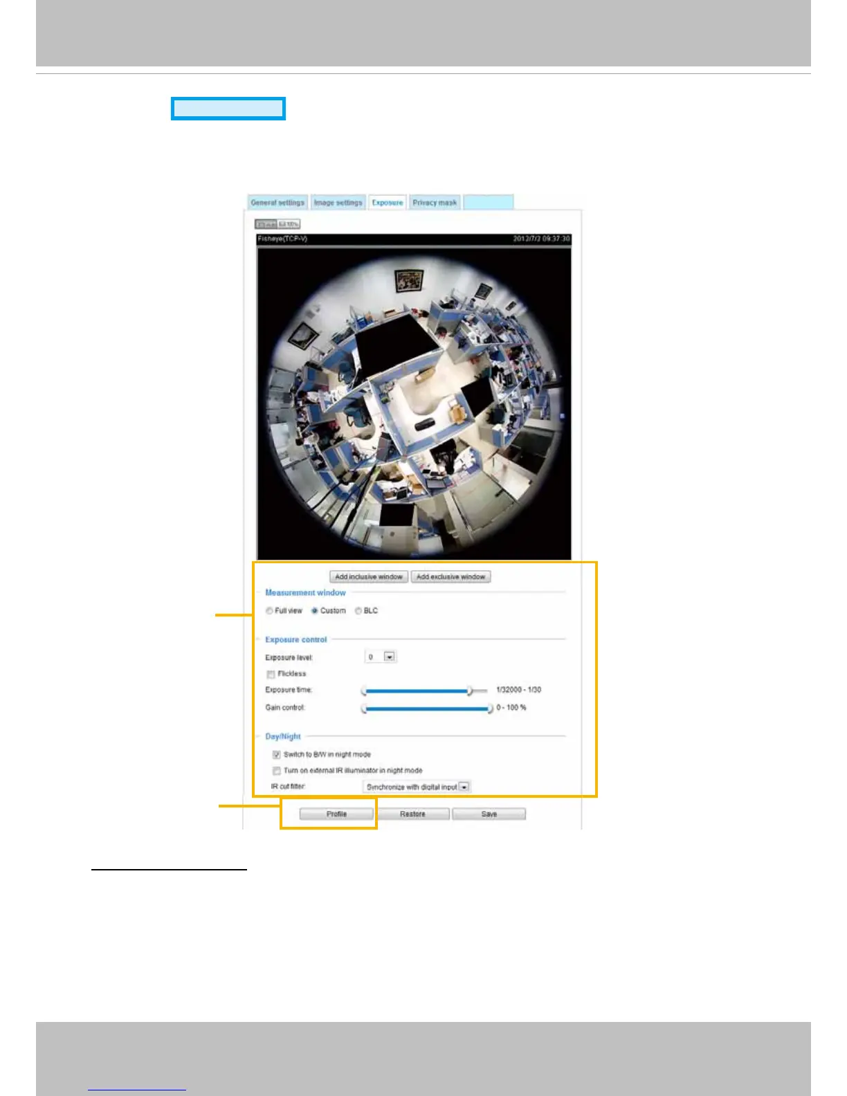 On this page, you can set the Exposure measurement window, Exposure level, Exposure mode,