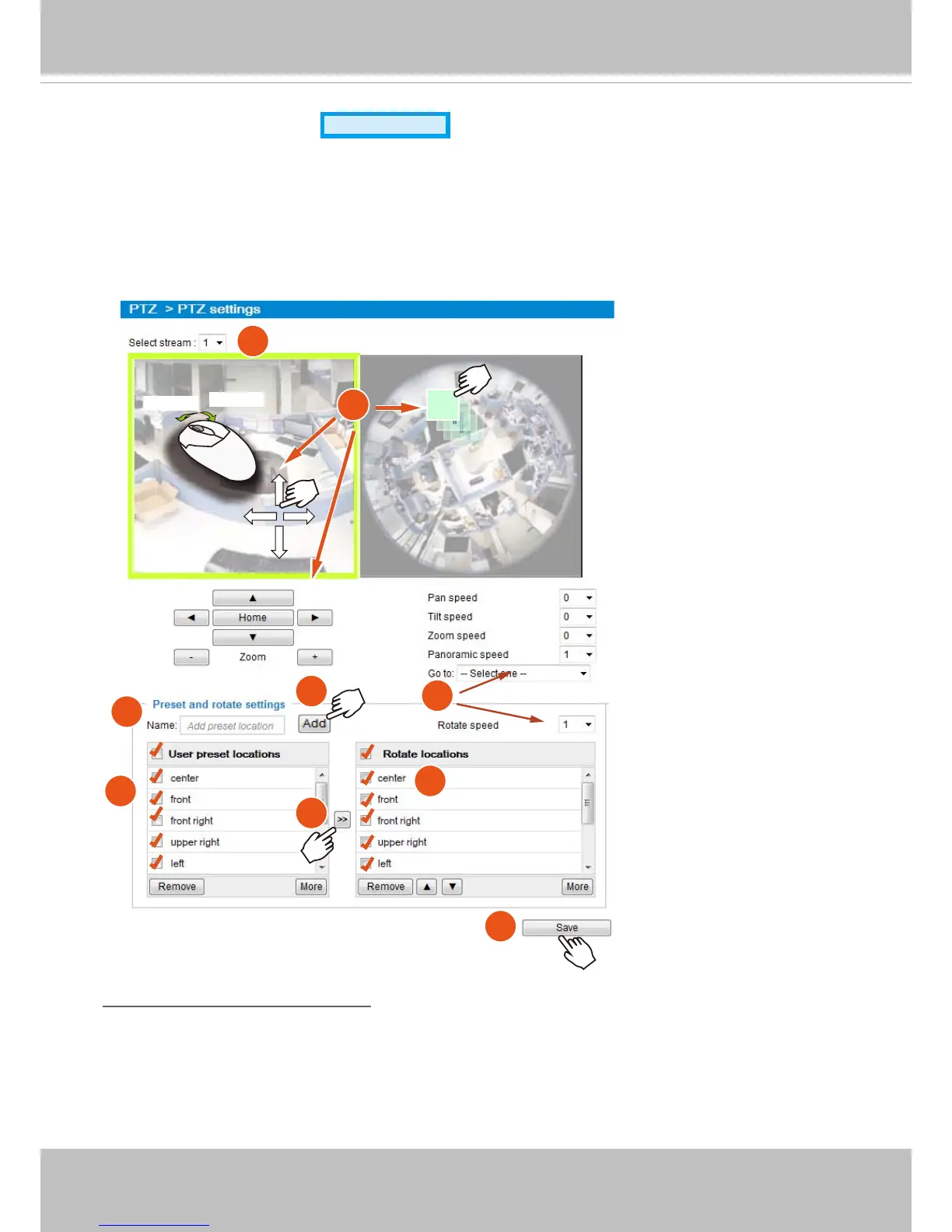 In the PTZ settings page, you can create preset positions in the hemisphere covered by the sheye lens.