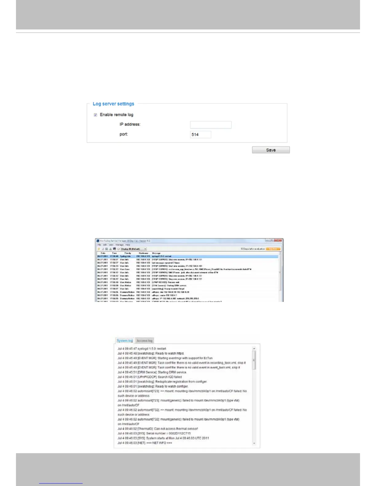 messages from the Network Camera. An example is Kiwi Syslog Daemon. Visit http://www.kiwisyslog.