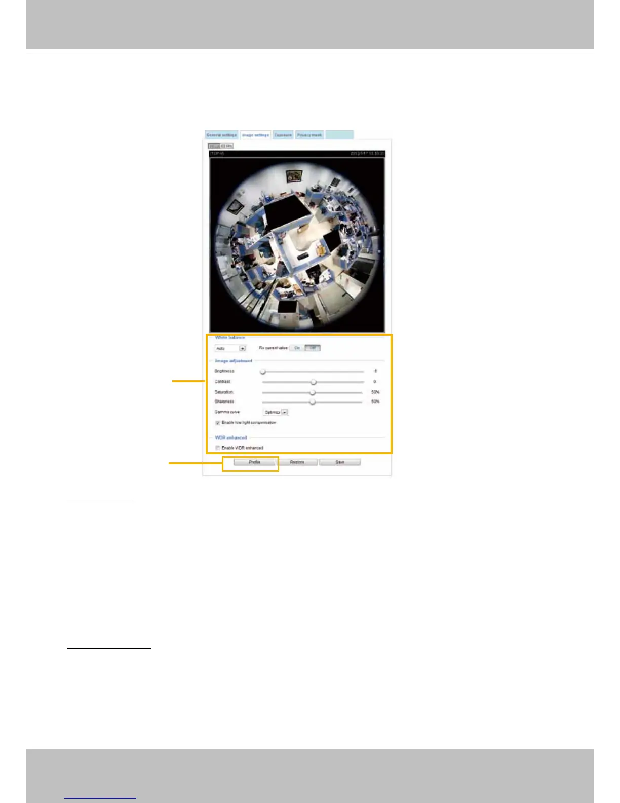 On this page, you can tune the White balance, Image adjustment and WDR enhanced parameters. You