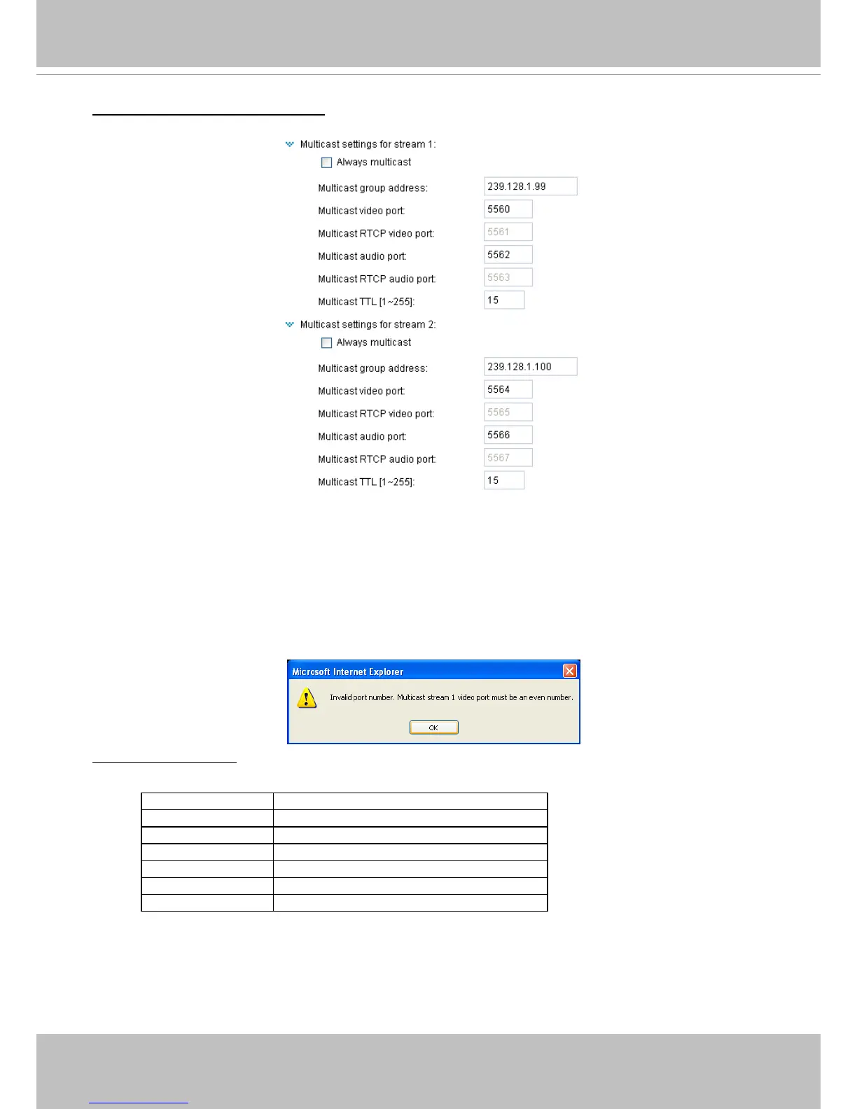 If the multicast RTP video ports are incorrectly assigned, the following warning message will be